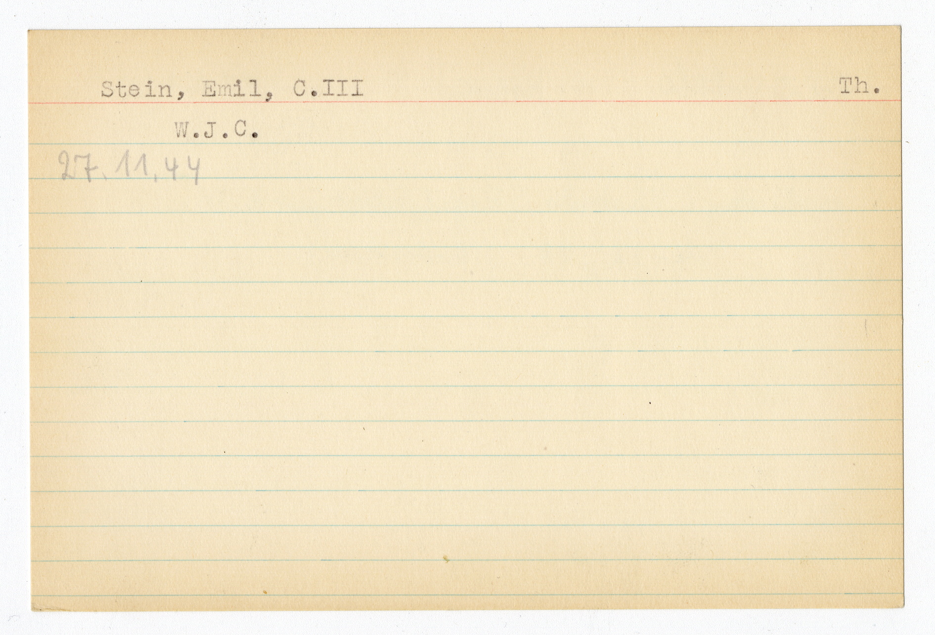 Ett skrivkort med patientuppgifter gällande Fela Falc. På baksidan uppgifter om matpaket till Emil Stein i Theresienstadt.
