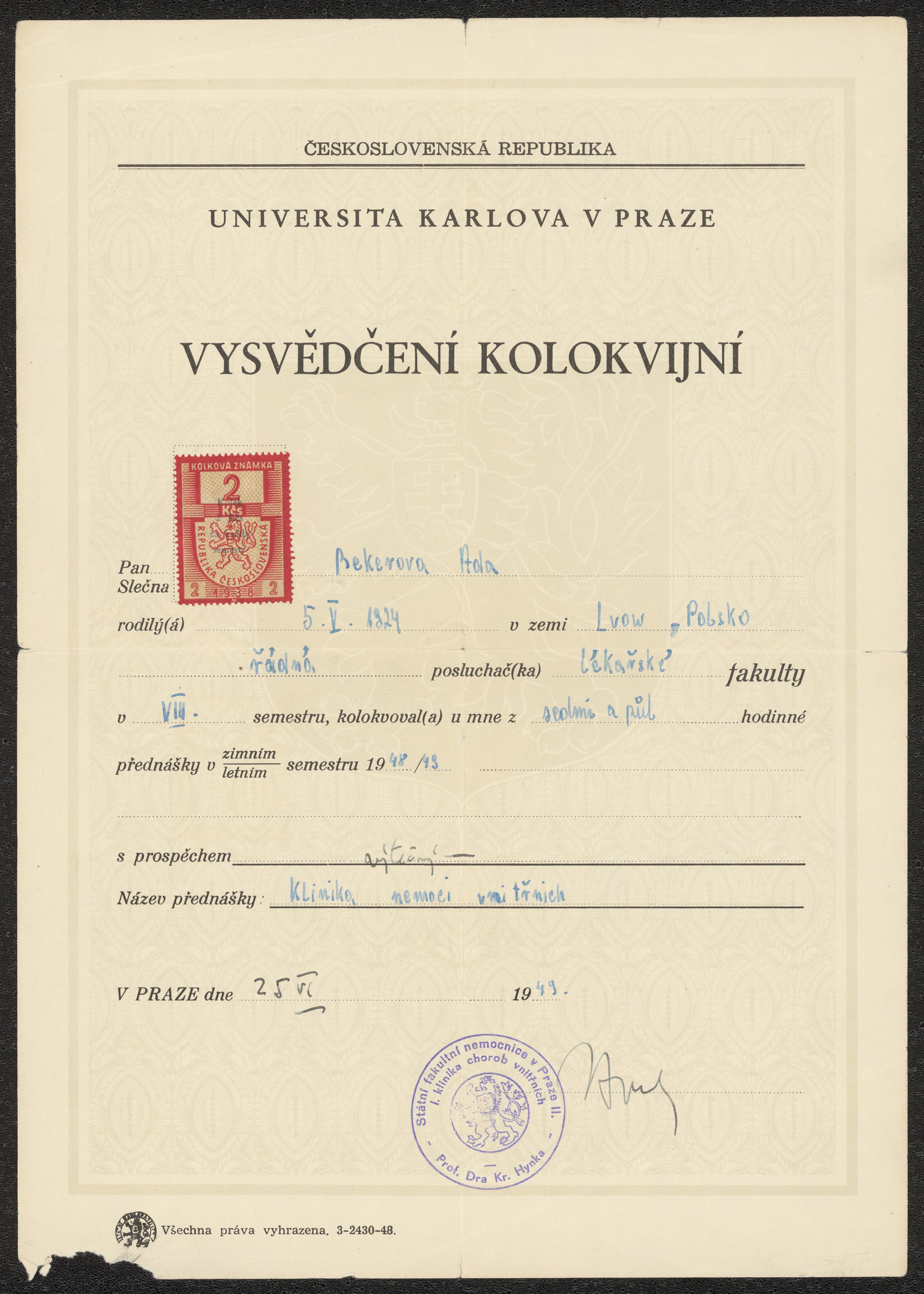 Certifikat för deltagande i seminarier i Prag, för student Ada Becker.
