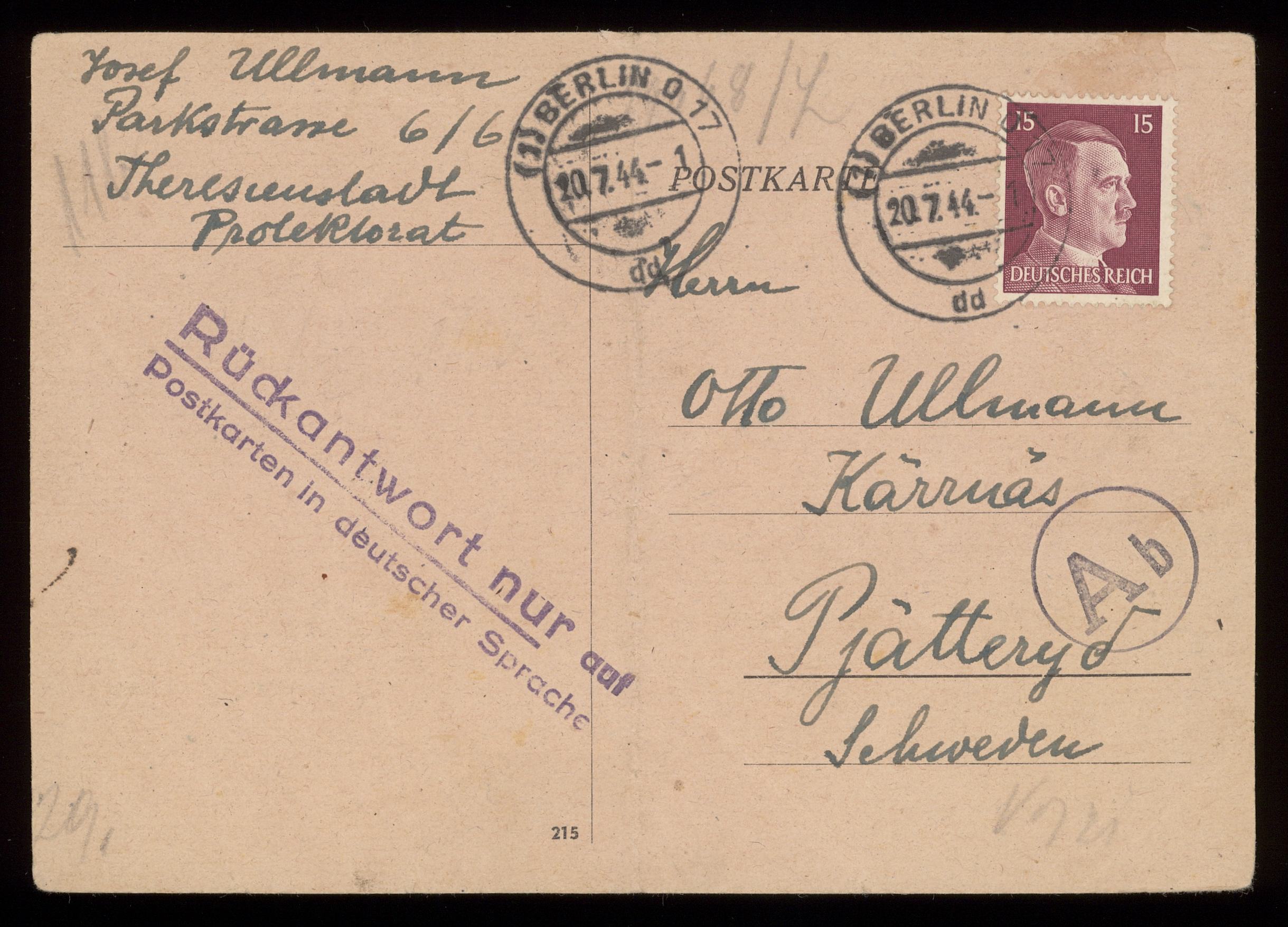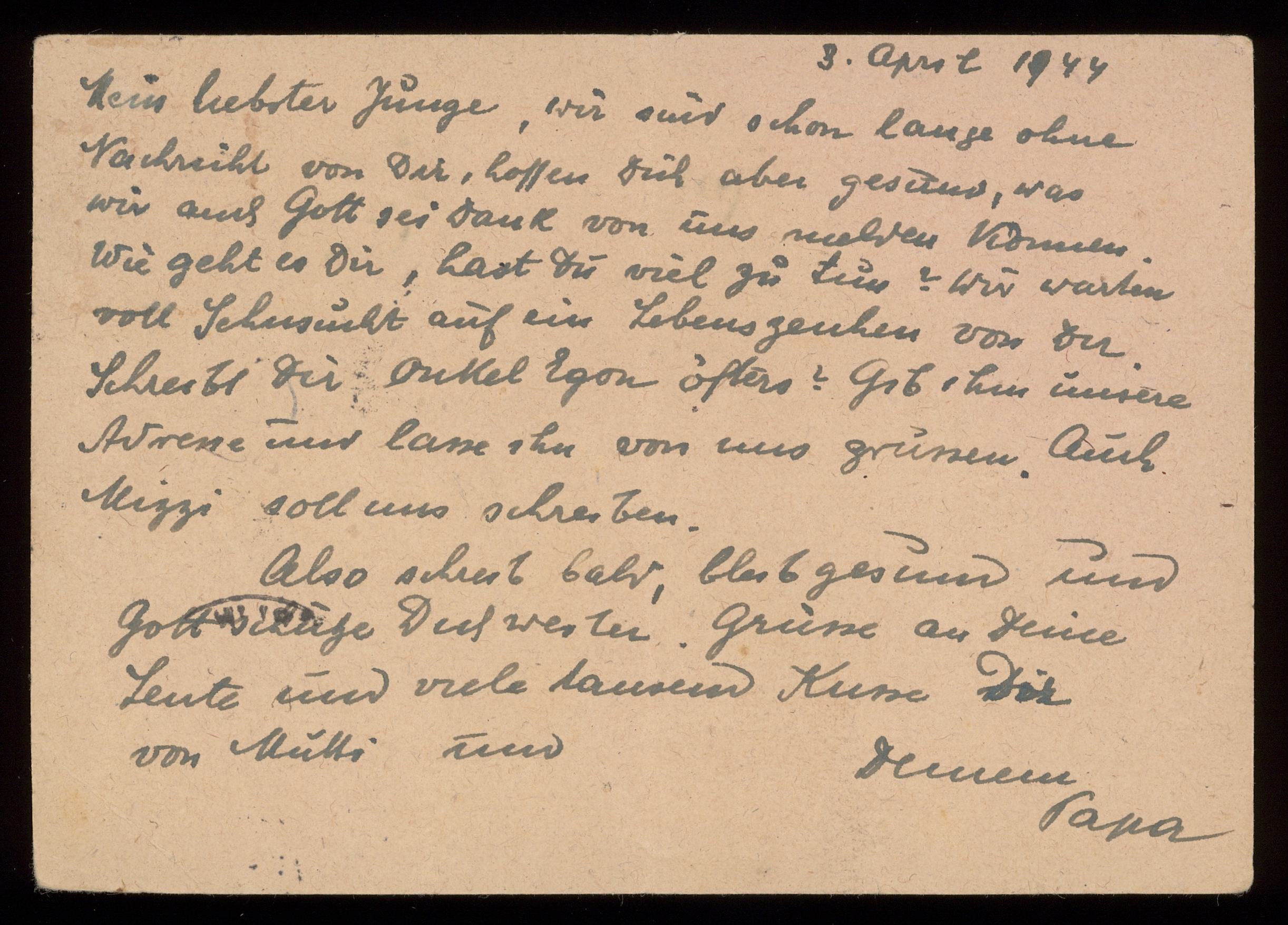 Brev till Otto Ullman från föräldrarna Josef och Elise Ullmann daterat 3 april 1944 Theresienstadt.