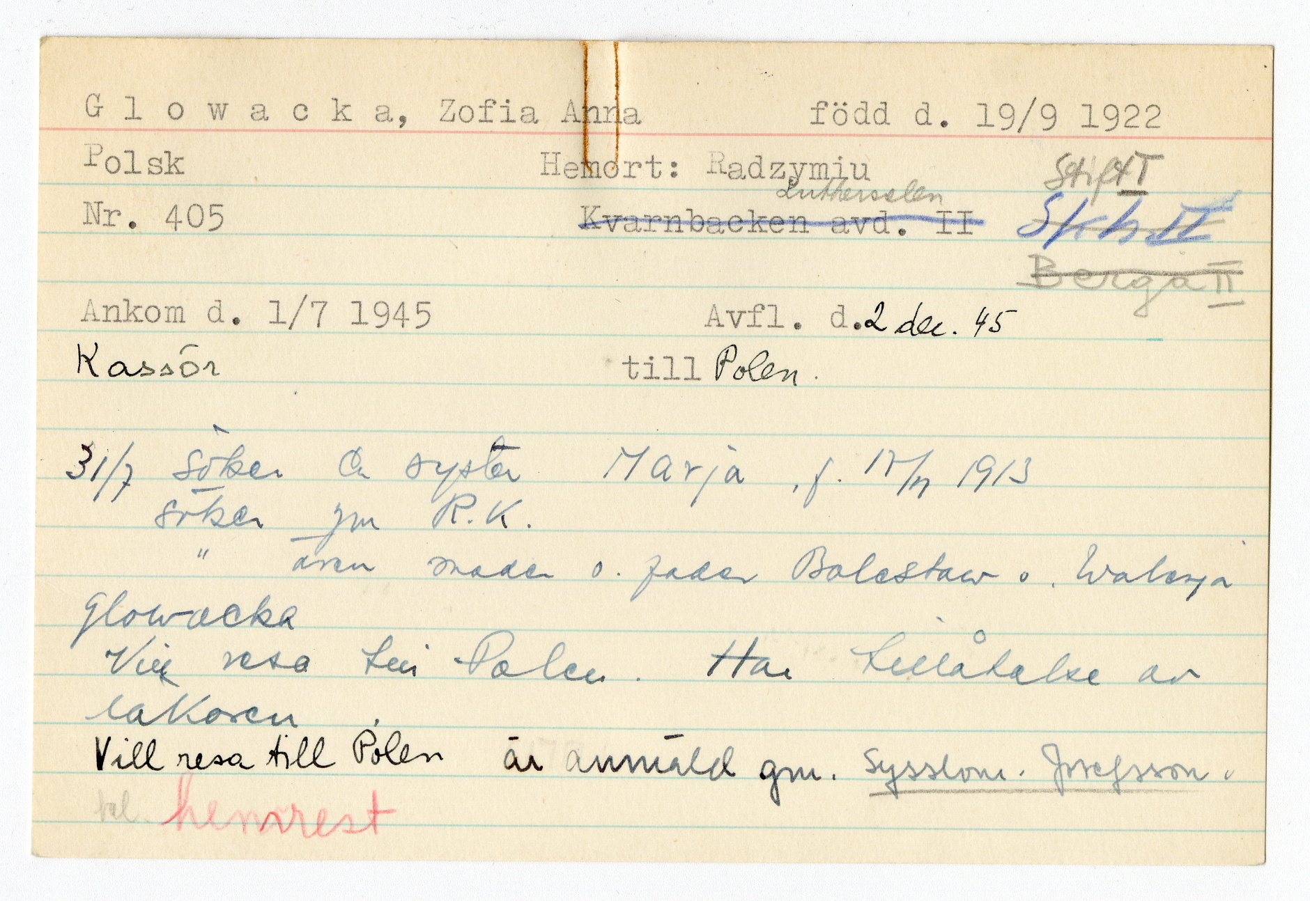 Registerkort Zofia Anna Glowacka