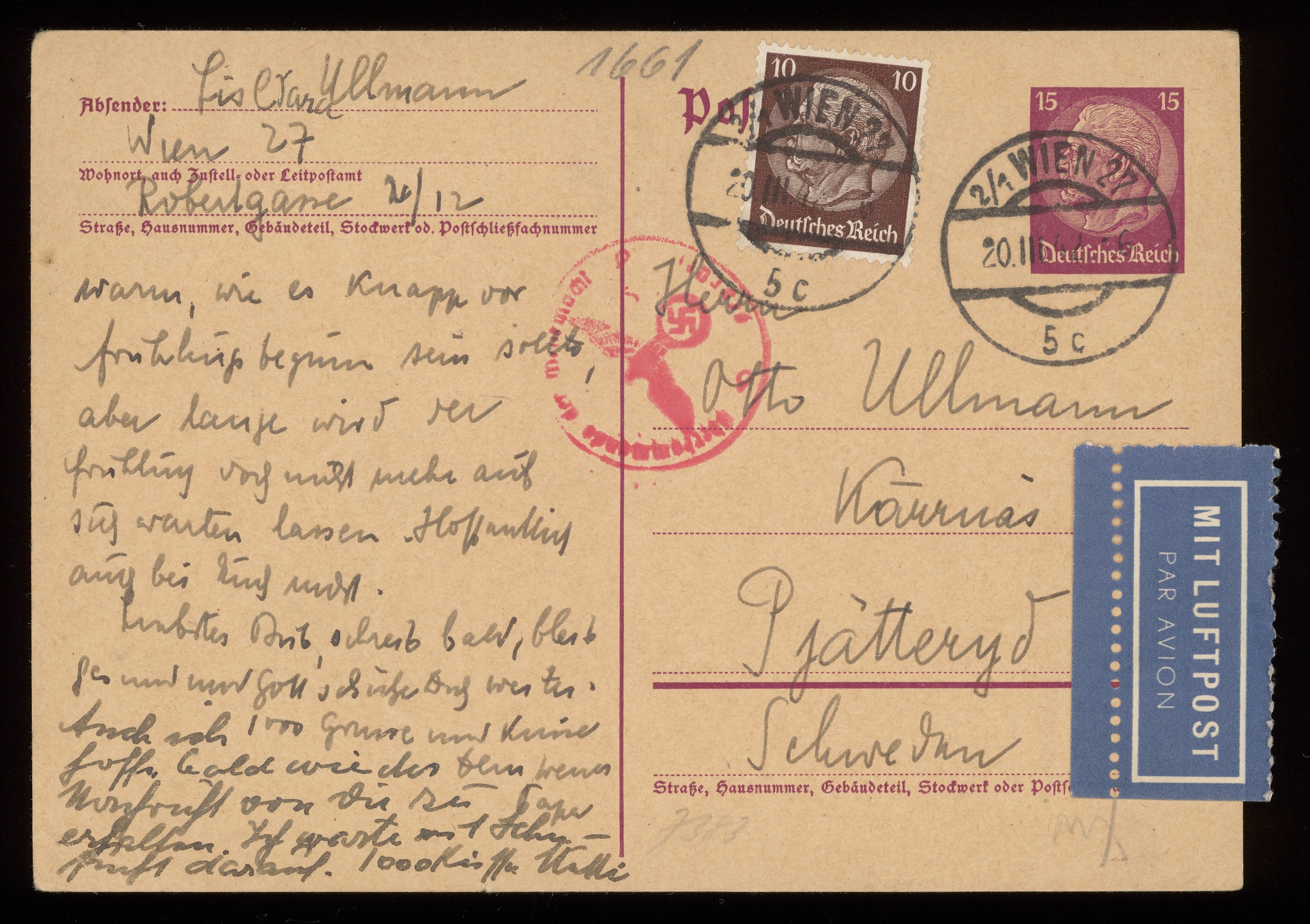 Brev till Otto Ullman från föräldrarna Josef och Elise Ullmann daterat 15 mars 1942 Wien.