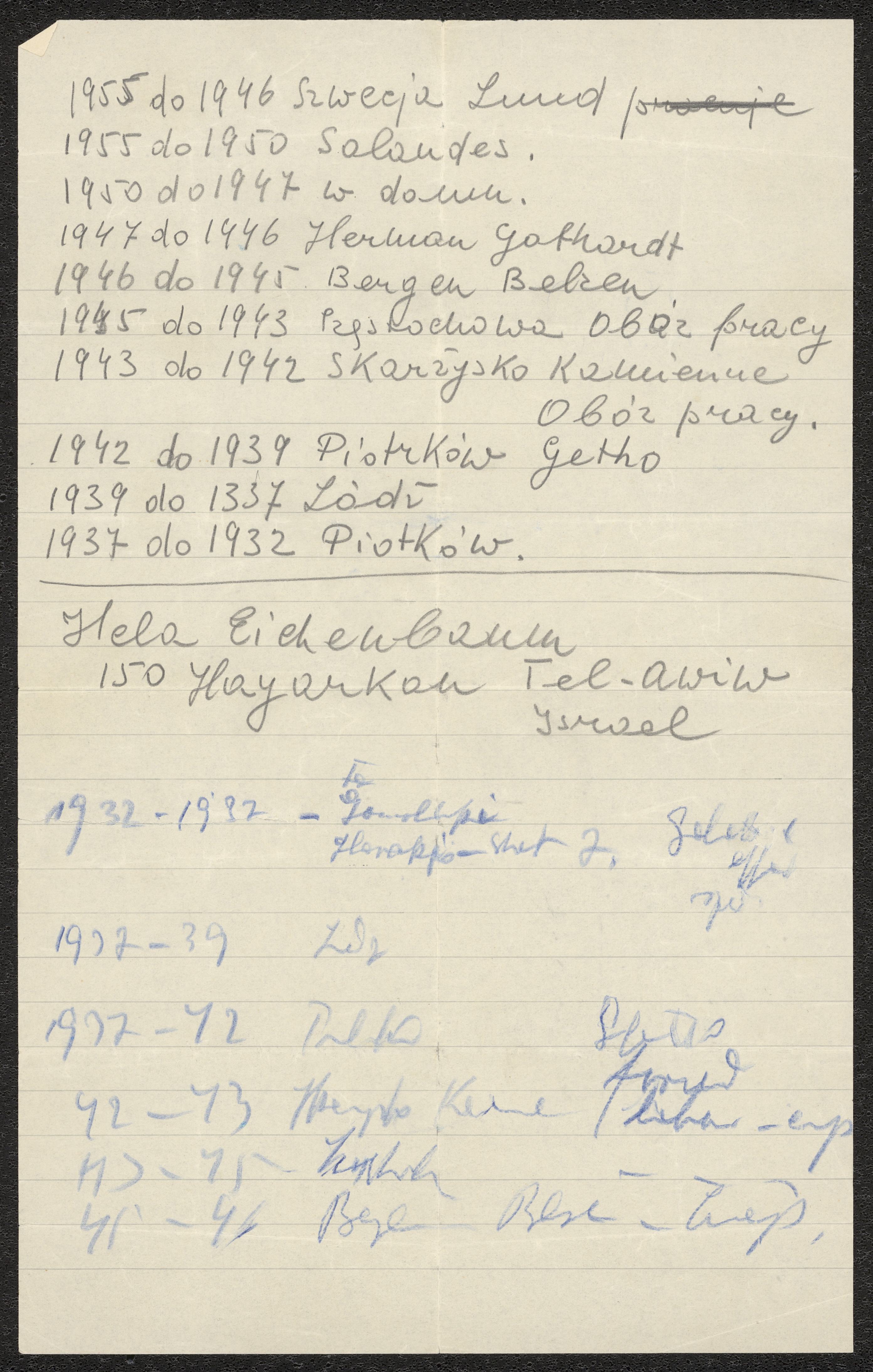 En lös anteckningssida fylld av noteringar gjorda av Rozia Zyskind. Noteringarna består av årtal från 1937 till 1955 samt de platser där Zyskind då befann sig, eller avgörande händelser som skedde vid tiden.
