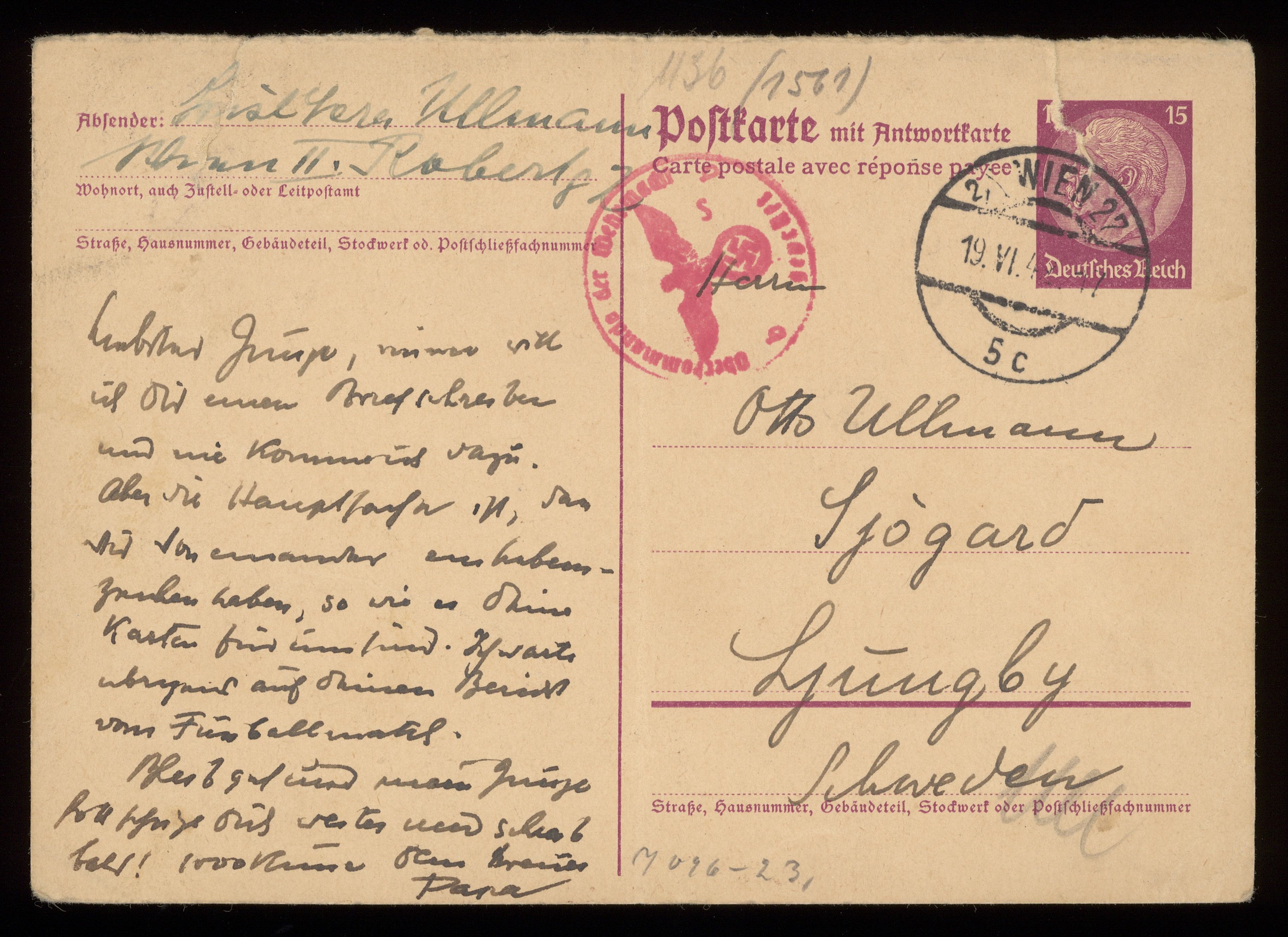 Brev till Otto Ullman från föräldrarna Josef och Elise Ullmann daterat 19 juni 1942 Wien.