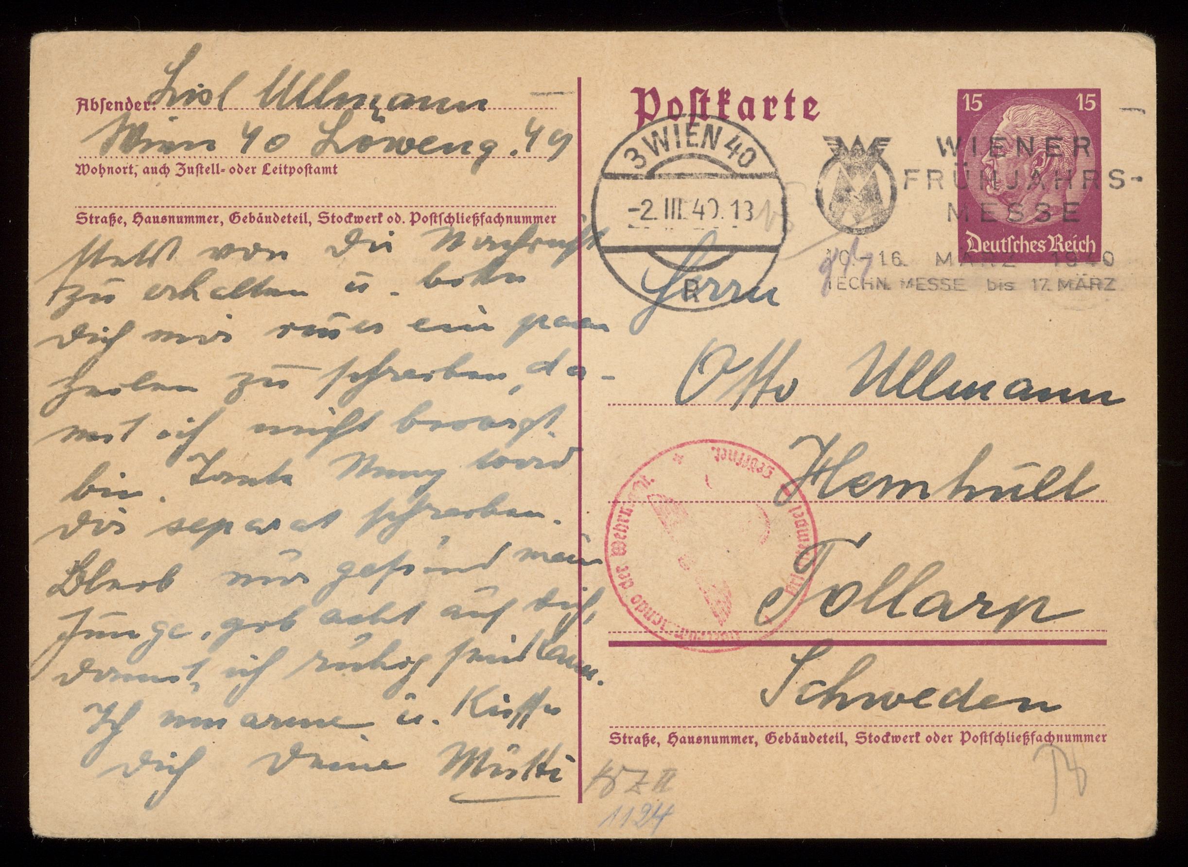 Brev till Otto Ullman från föräldrarna Josef och Elise Ullmann daterat 2 mars 1940 Wien.