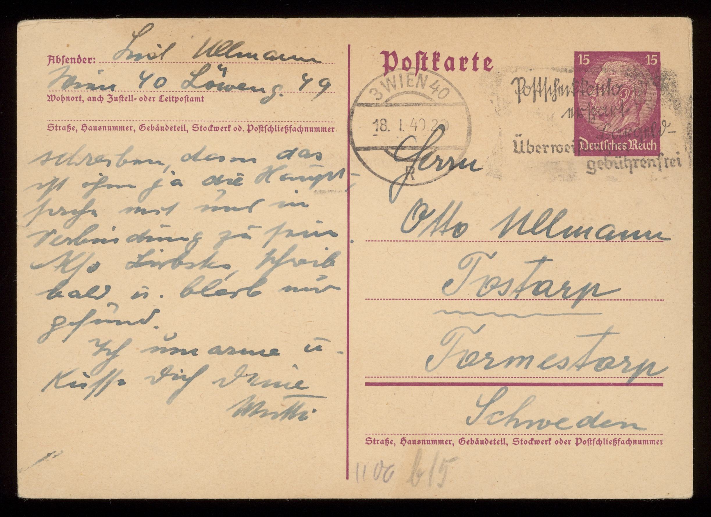 Brev till Otto Ullman från föräldrarna Josef och Elise Ullmann daterat 18 januari 1940 Wien.