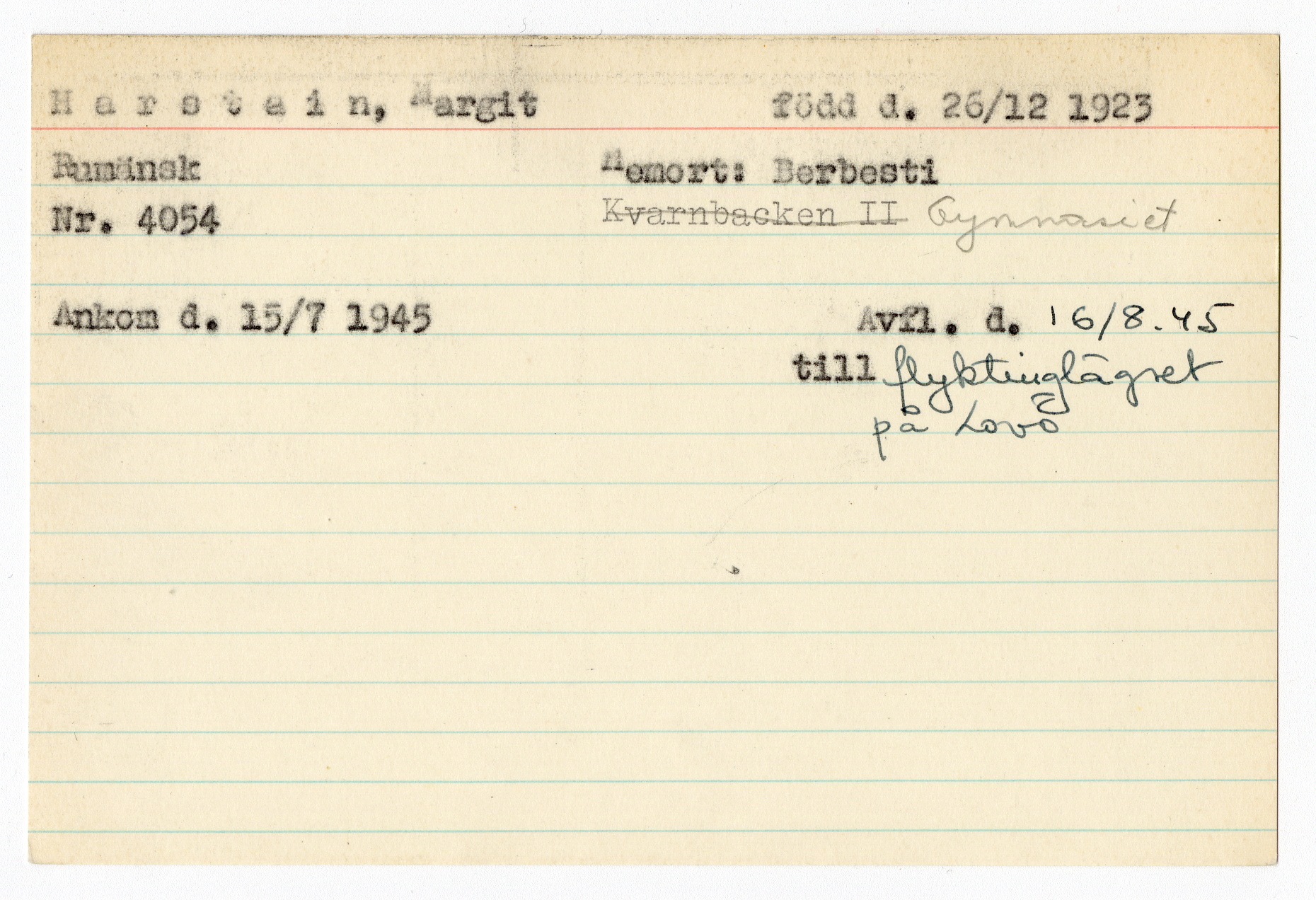 Ett skrivkort med patientuppgifter gällande Margit Harstain.