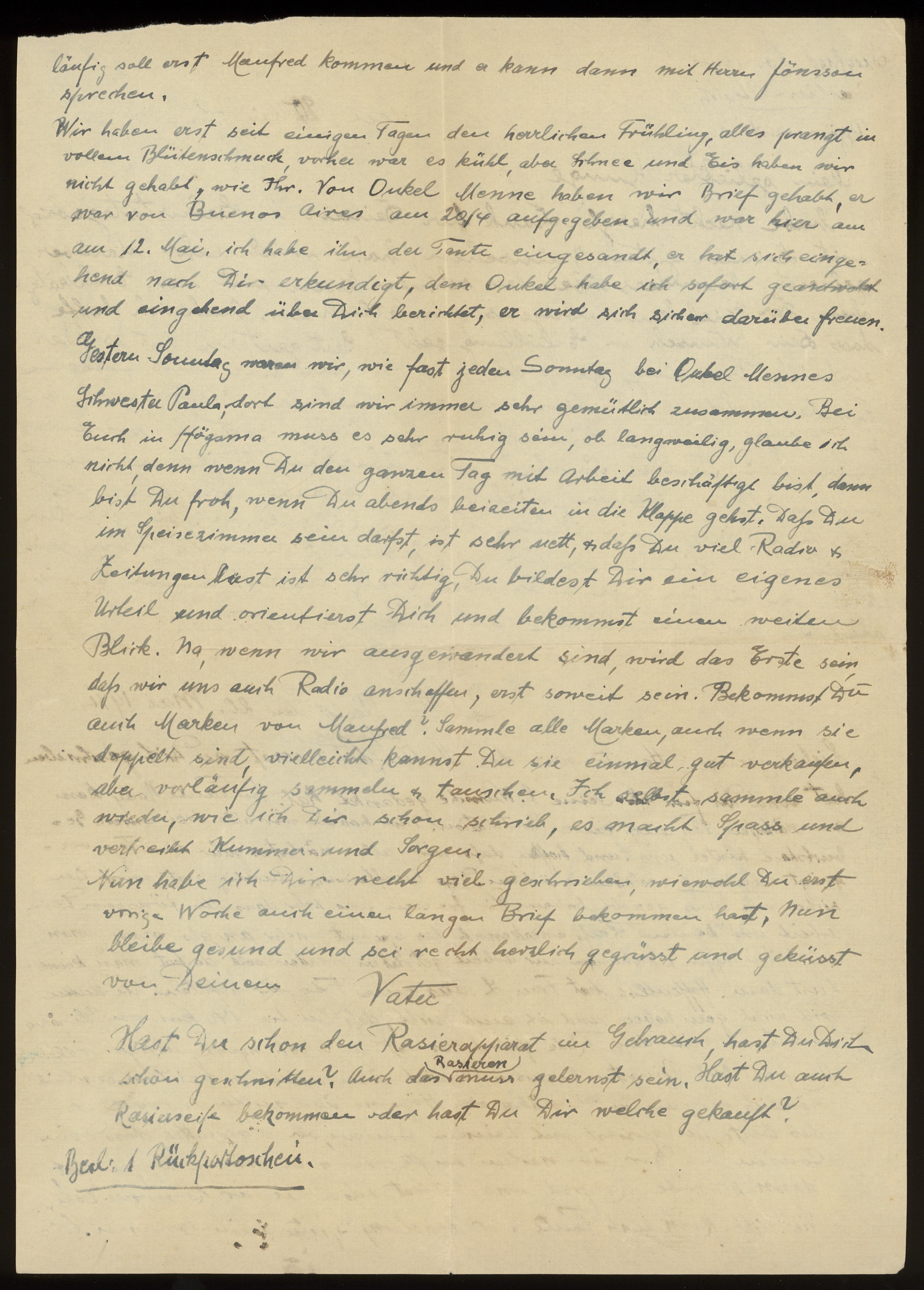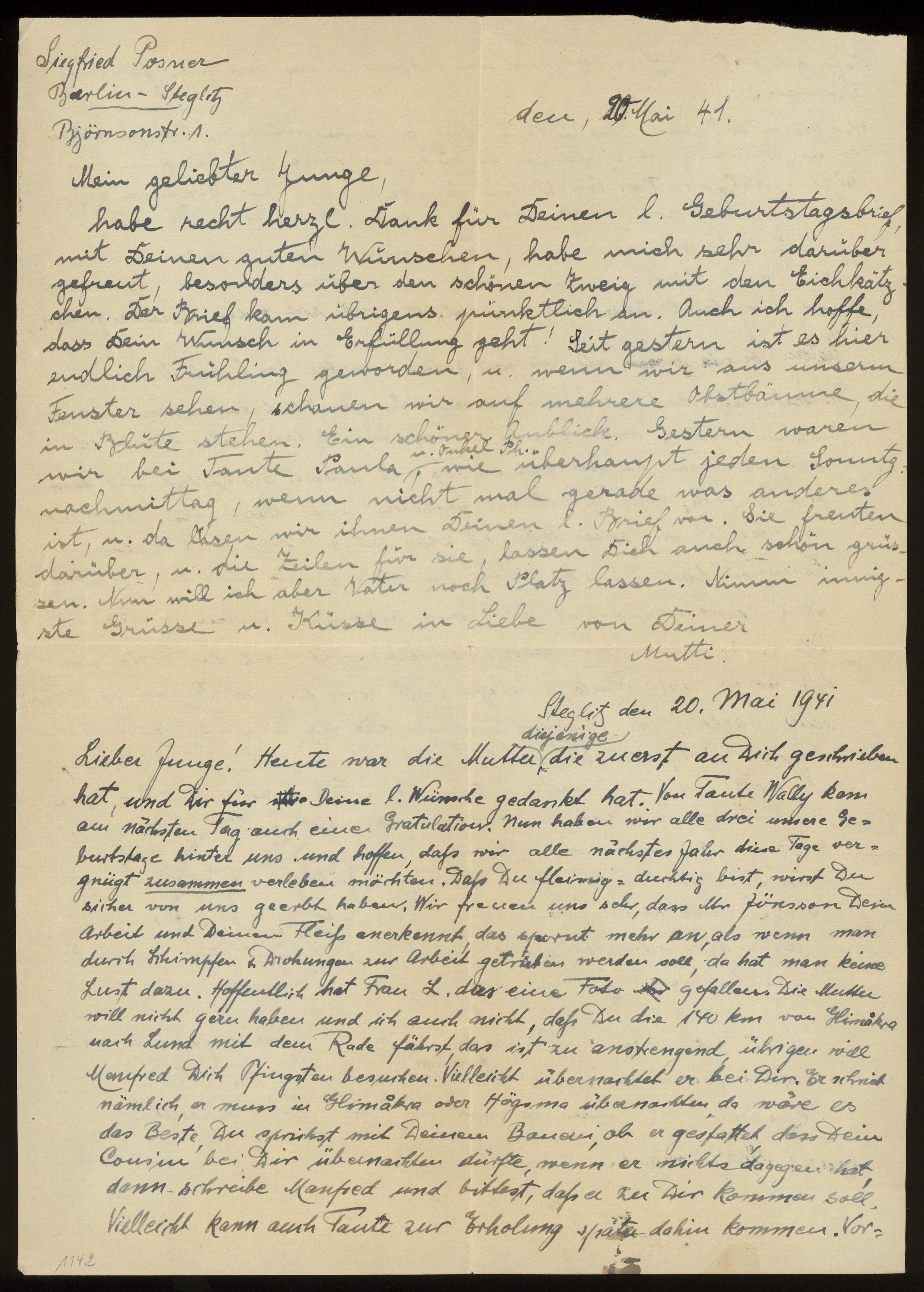 Brev från föräldrarna Anna och Siegfried Posner till sonen Ludwig Posner daterat 20 maj 1941.