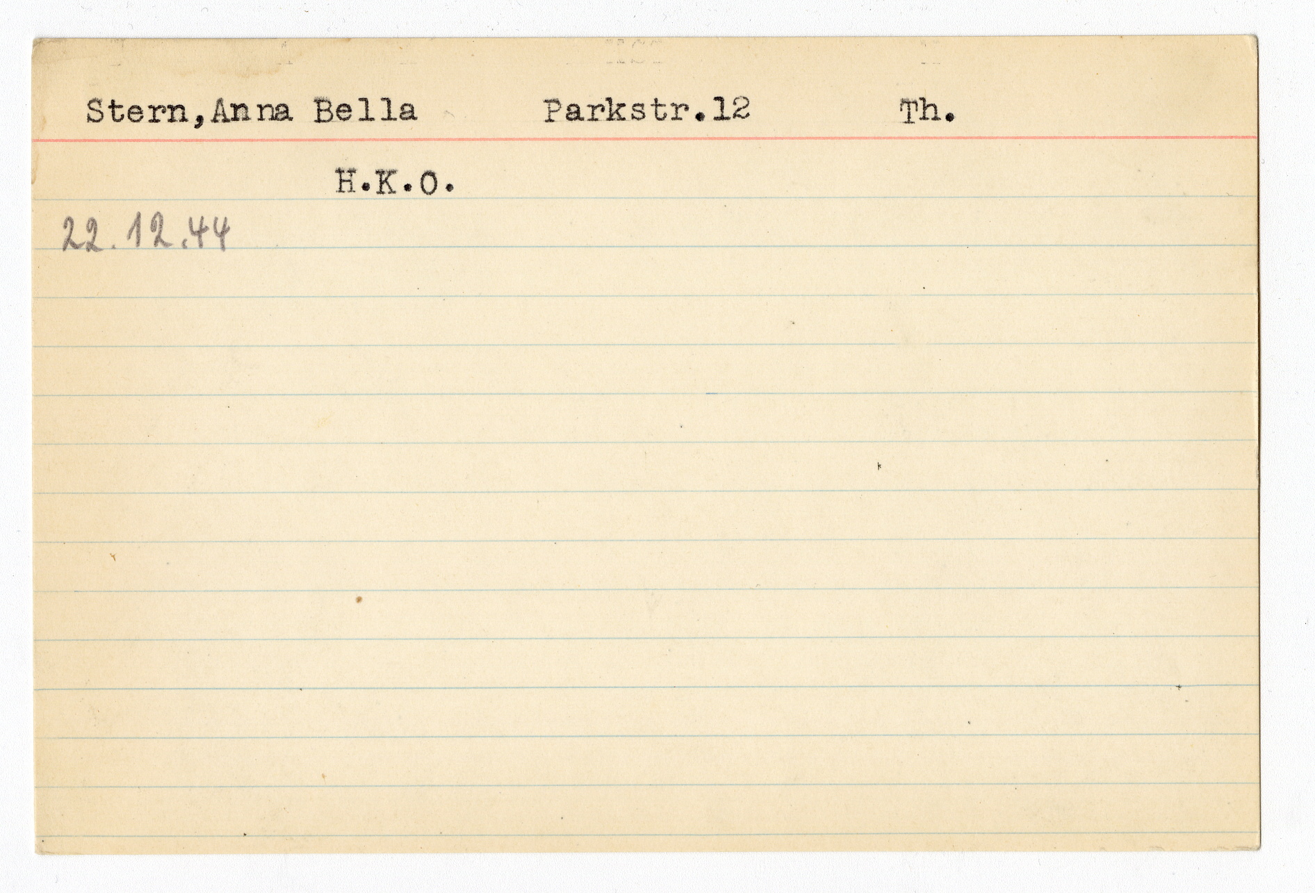 Ett skrivkort med patientuppgifter gällande Antonia Munk. På baksidan uppgifter om matpaket till Anna Stern i Theresienstadt.