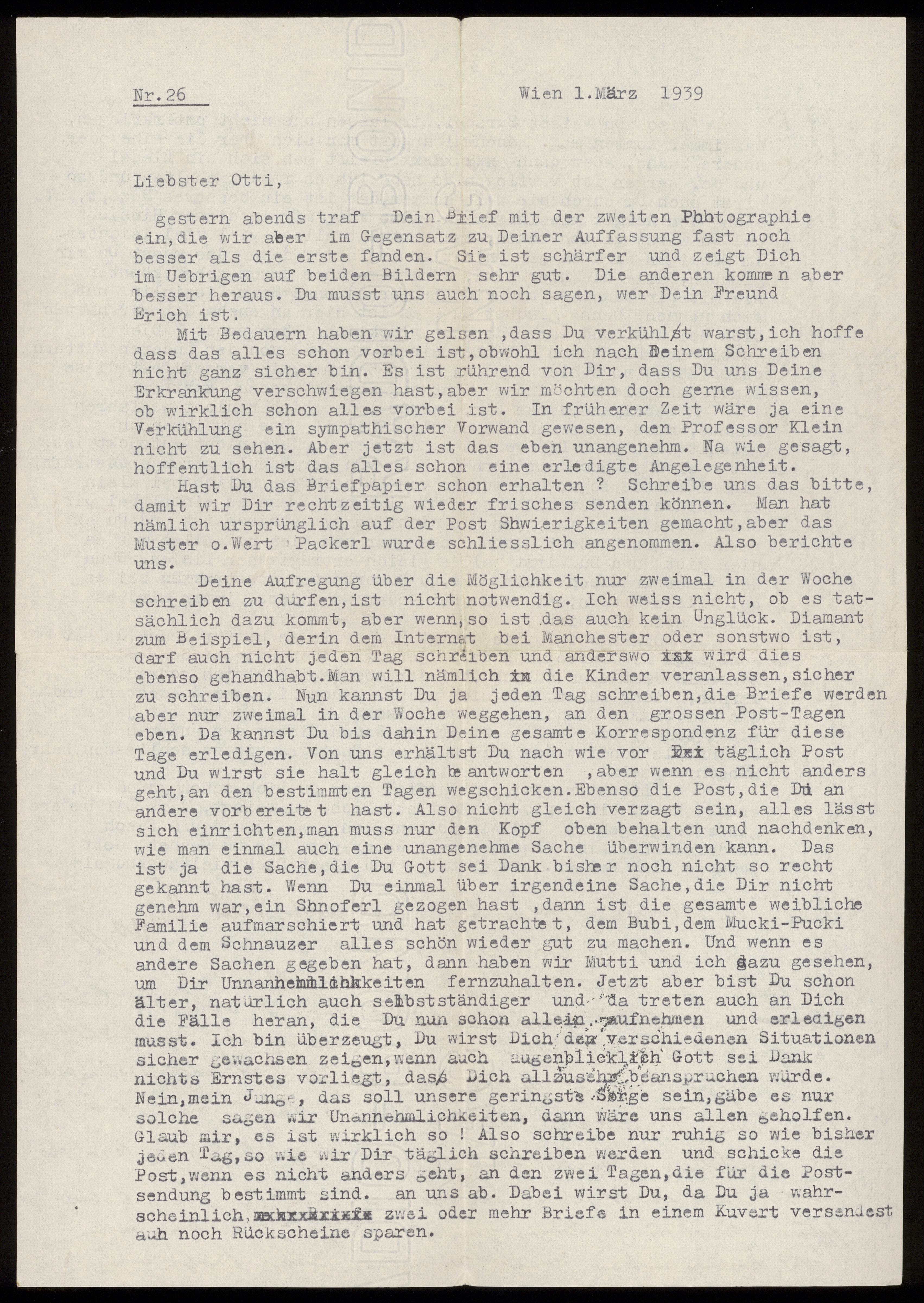 Maskinskrivet brev till Otto Ullman från föräldrarna Josef och Elise Ullmann daterat 1 mars 1939 Wien.