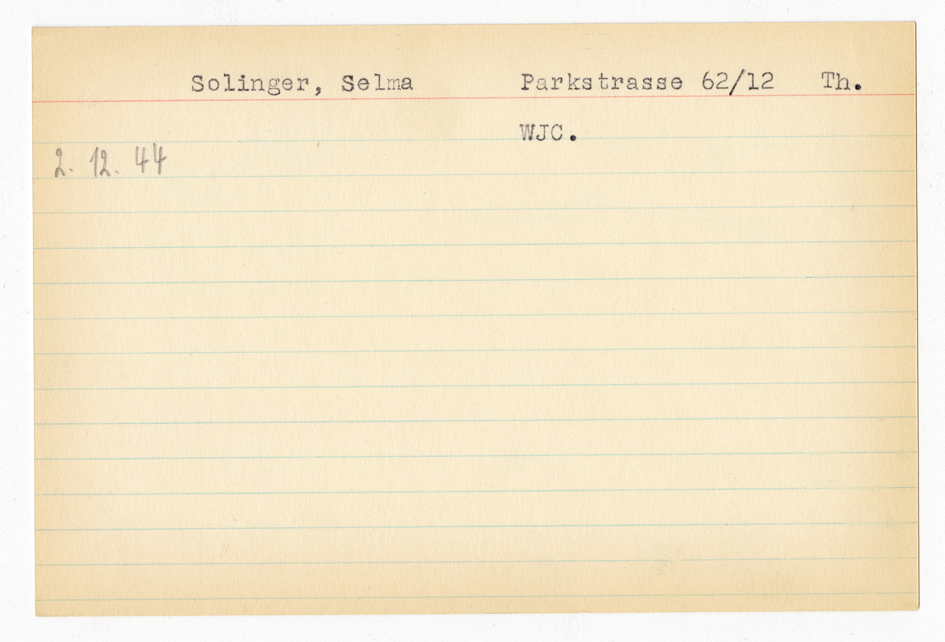Ett skrivkort med patientuppgifter gällande Dora Dicker. På baksidan uppgifter om matpaket till Selma Solinger i Theresienstadt.