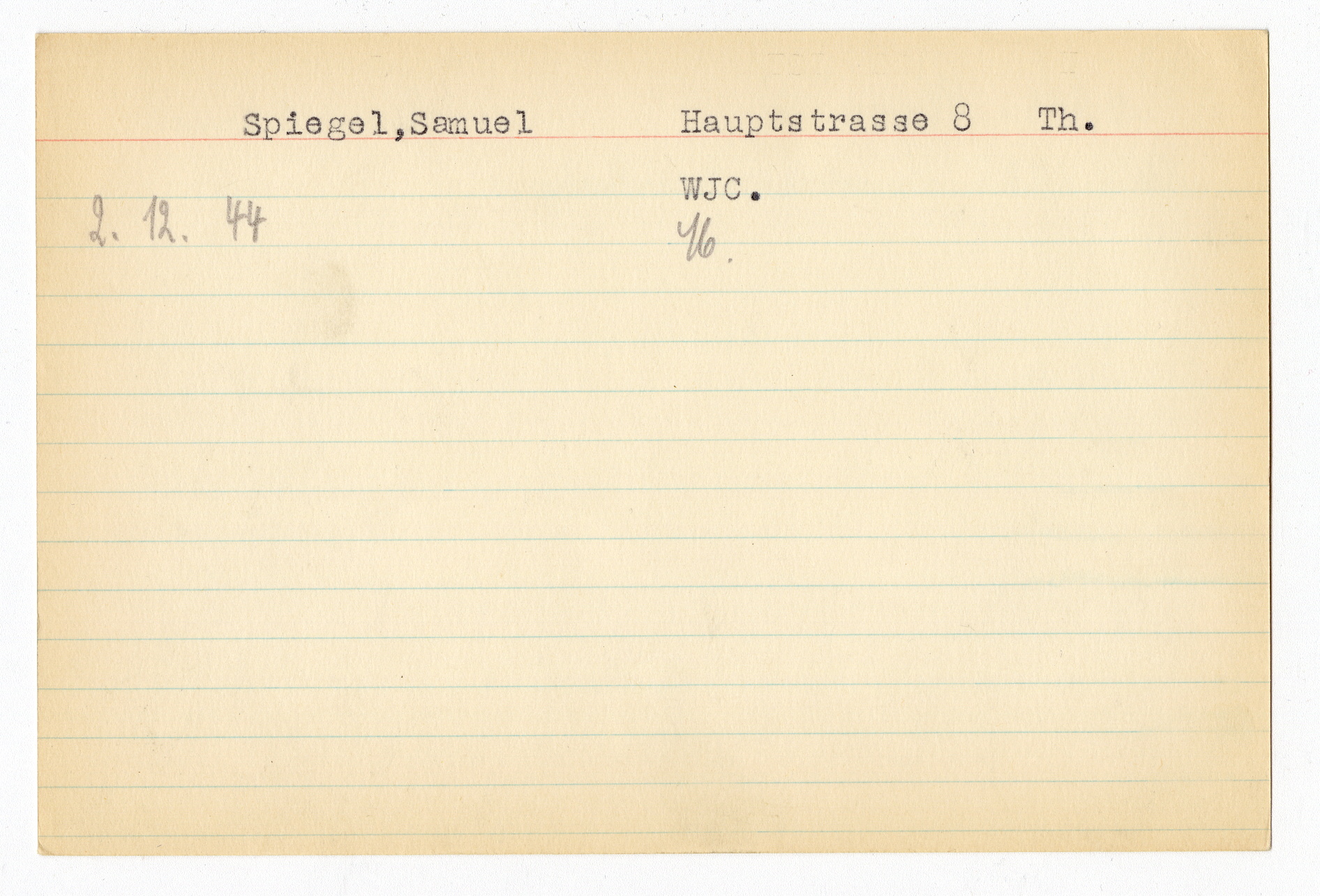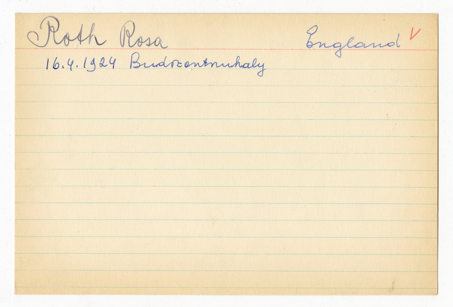 Ett skrivkort med patientuppgifter gällande Rosa Roth. På baksidan uppgifter om matpaket till Samuel Spiegel i Theresienstadt.