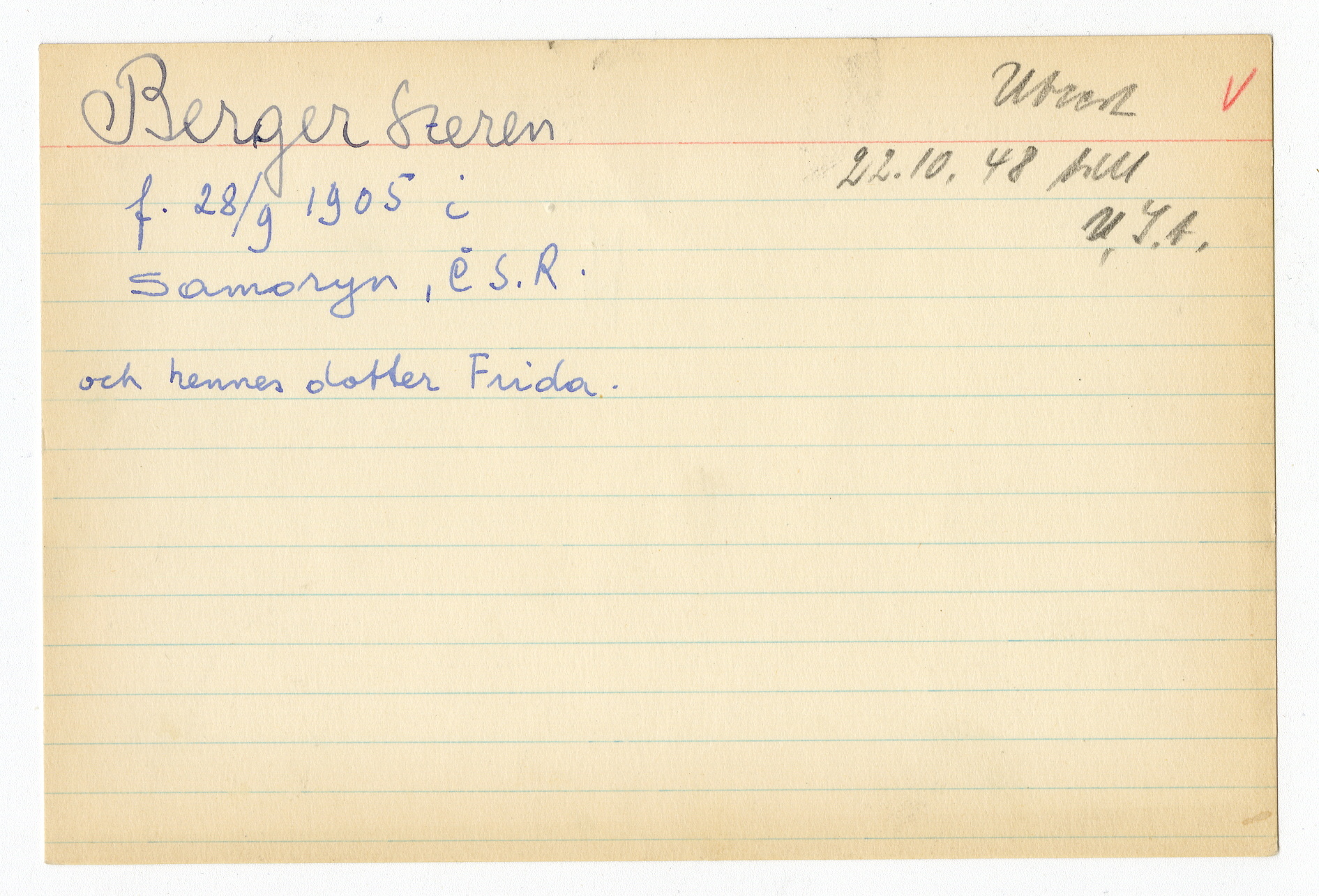 Ett skrivkort med patientuppgifter gällande Szeren Berger. På baksidan uppgifter om matpaket till Esther Schacht i Theresienstadt.