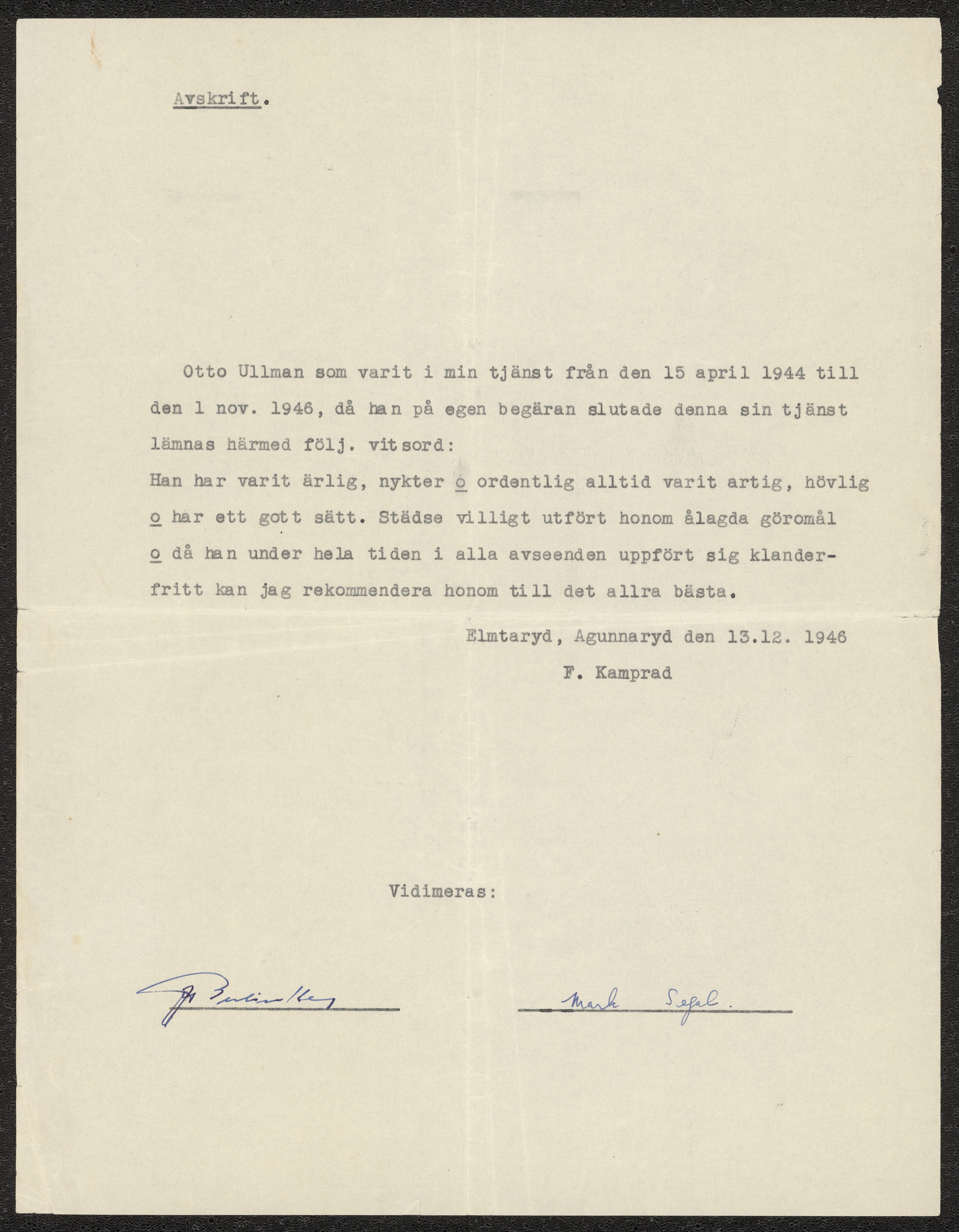 Tjänstgöringsbetyg från F. Kamprad
