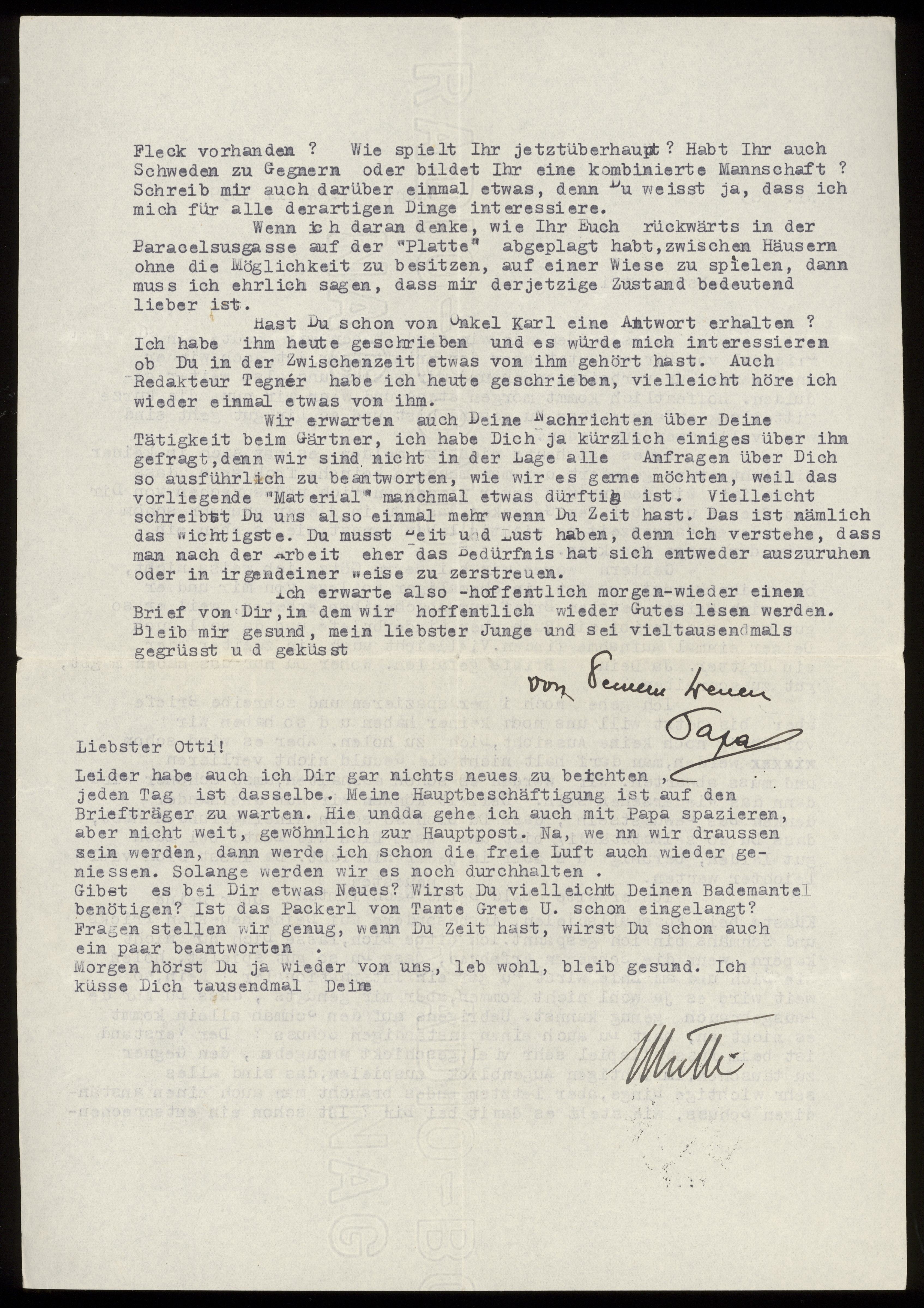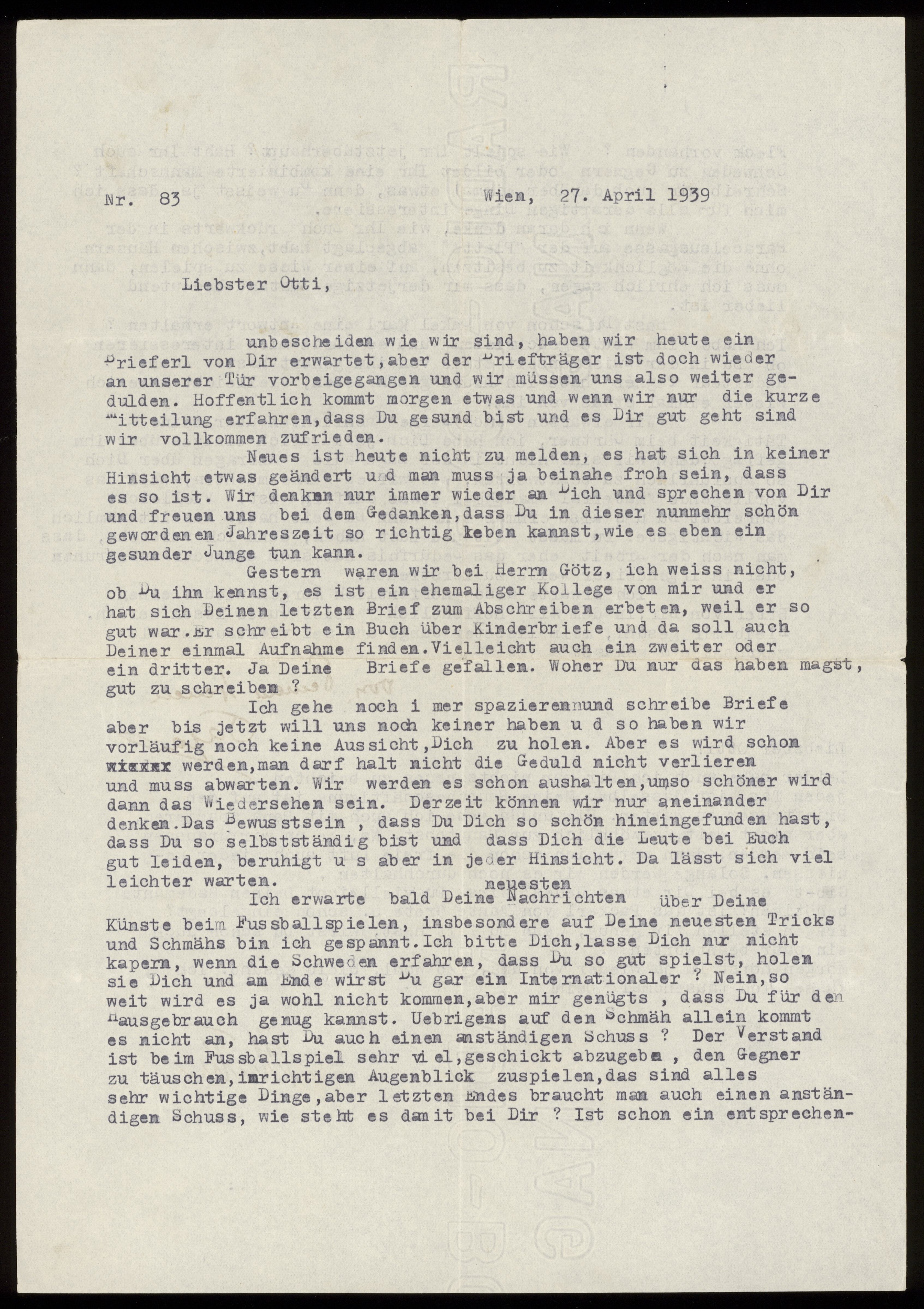 Maskinskrivet brev till Otto Ullman från föräldrarna Josef och Elise Ullmann daterat 27 april 1939 Wien.