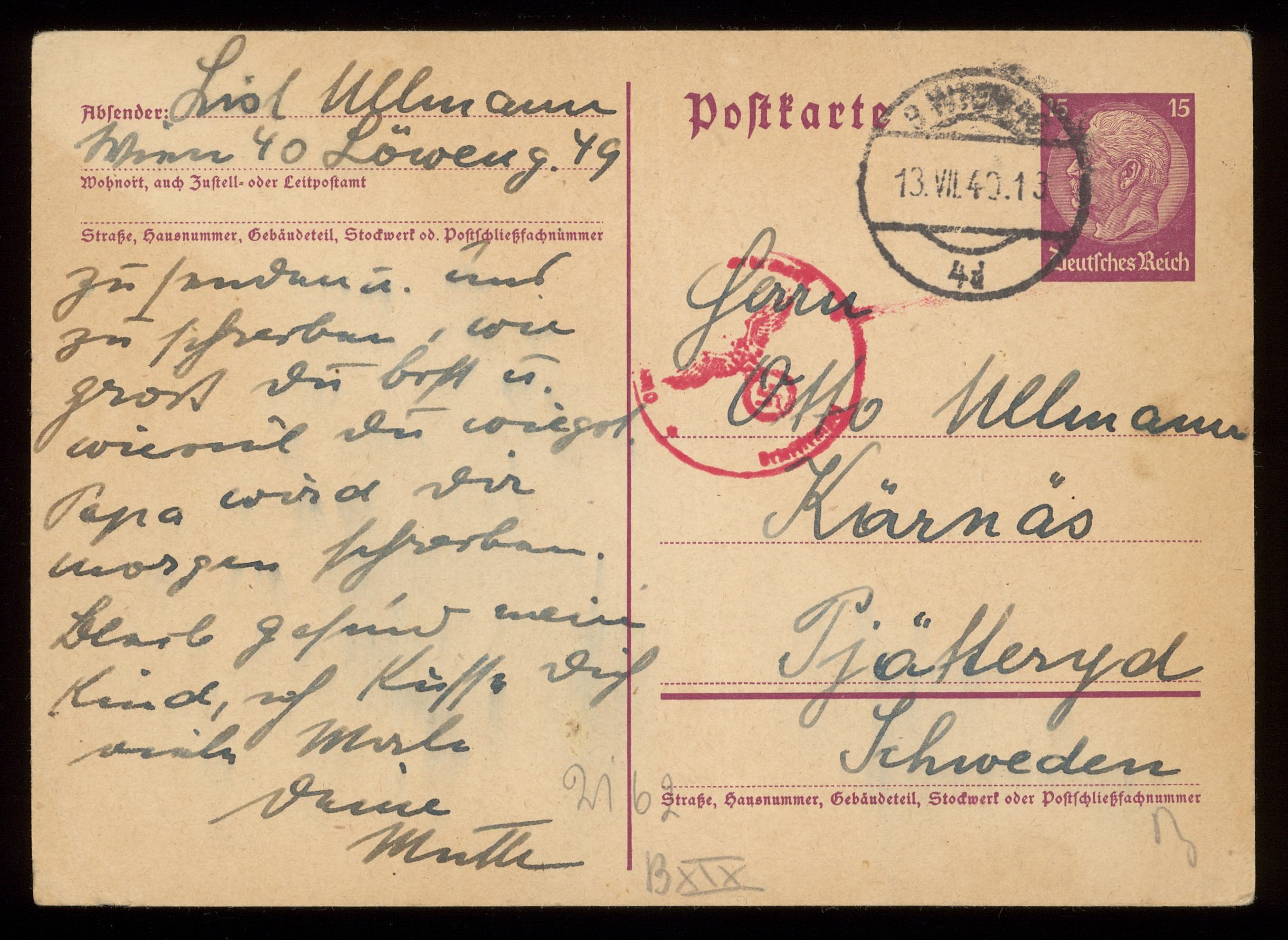 Brev till Otto Ullman från föräldrarna Josef och Elise Ullmann daterat 12 juli 1940 Wien.