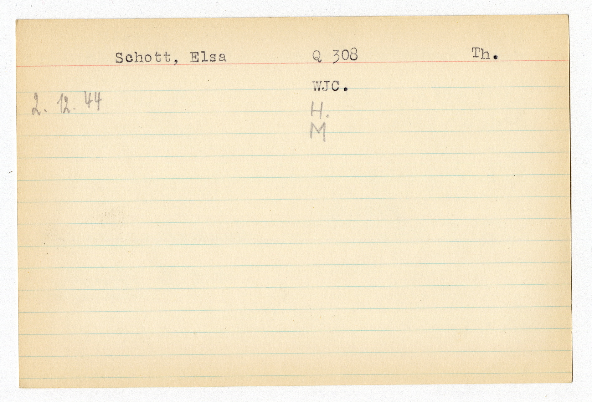 Ett skrivkort med patientuppgifter gällande Hanna Kaminska. På baksidan uppgifter om matpaket till Elsa Schott i Theresienstadt.
