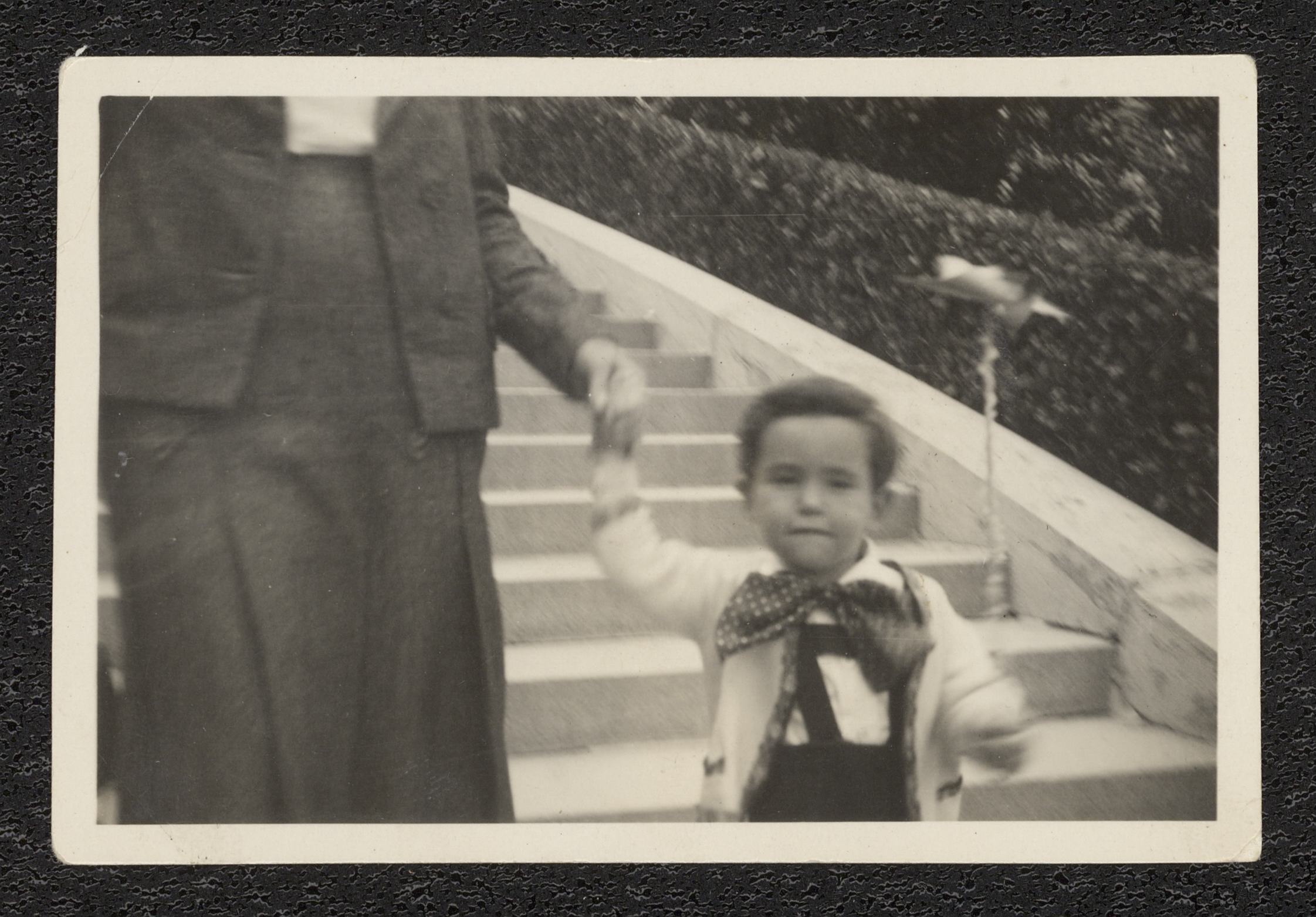 Fotografi föreställande Georg Witt som barn. Han håller en kvinna ihanden, på väg nedför en trappa.