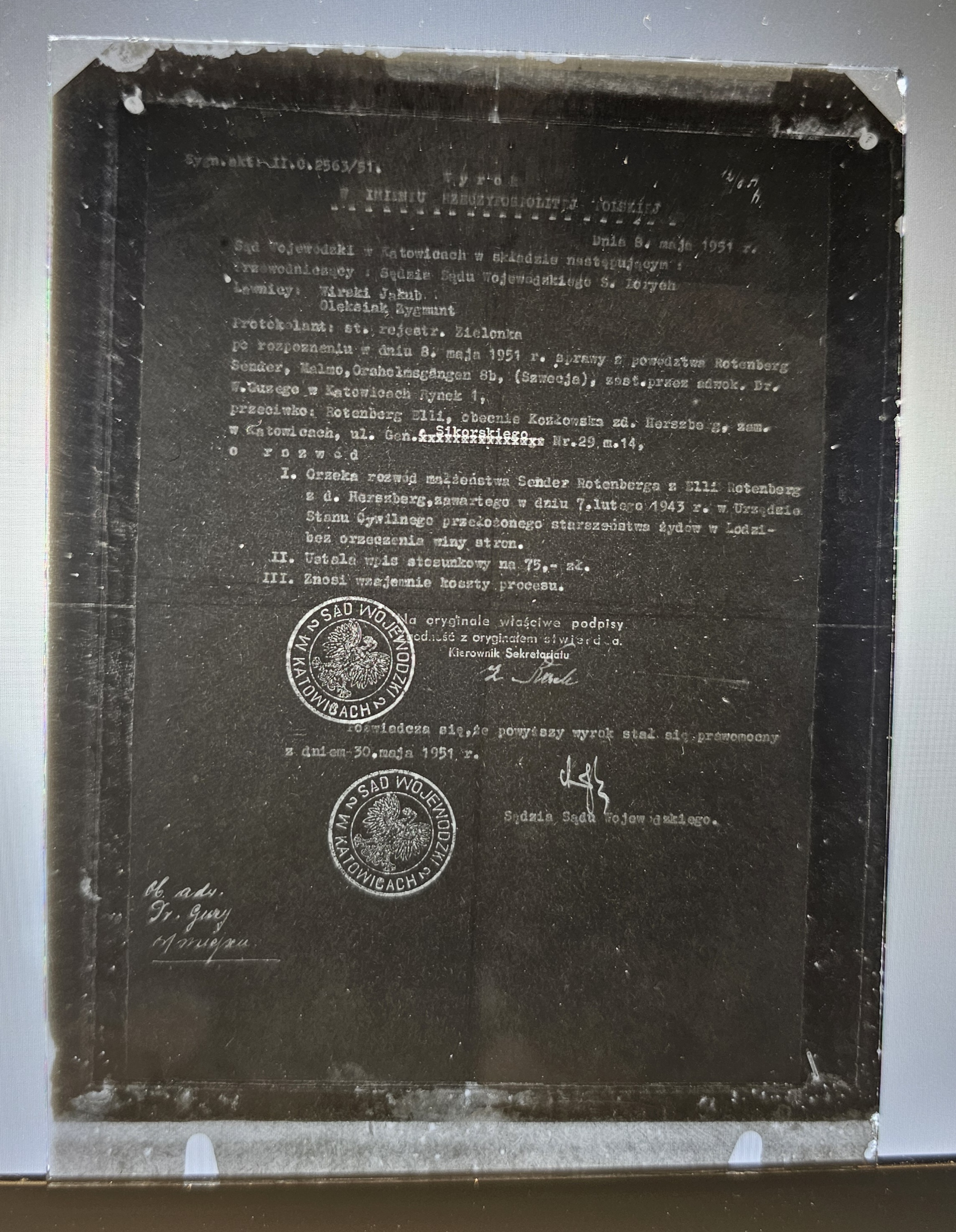 Fotografi på glasplåt av Sender Rotenbergs fångbevis för Dachau från International Tracing Service. Originaldokumentet är daterat 1954-06-16