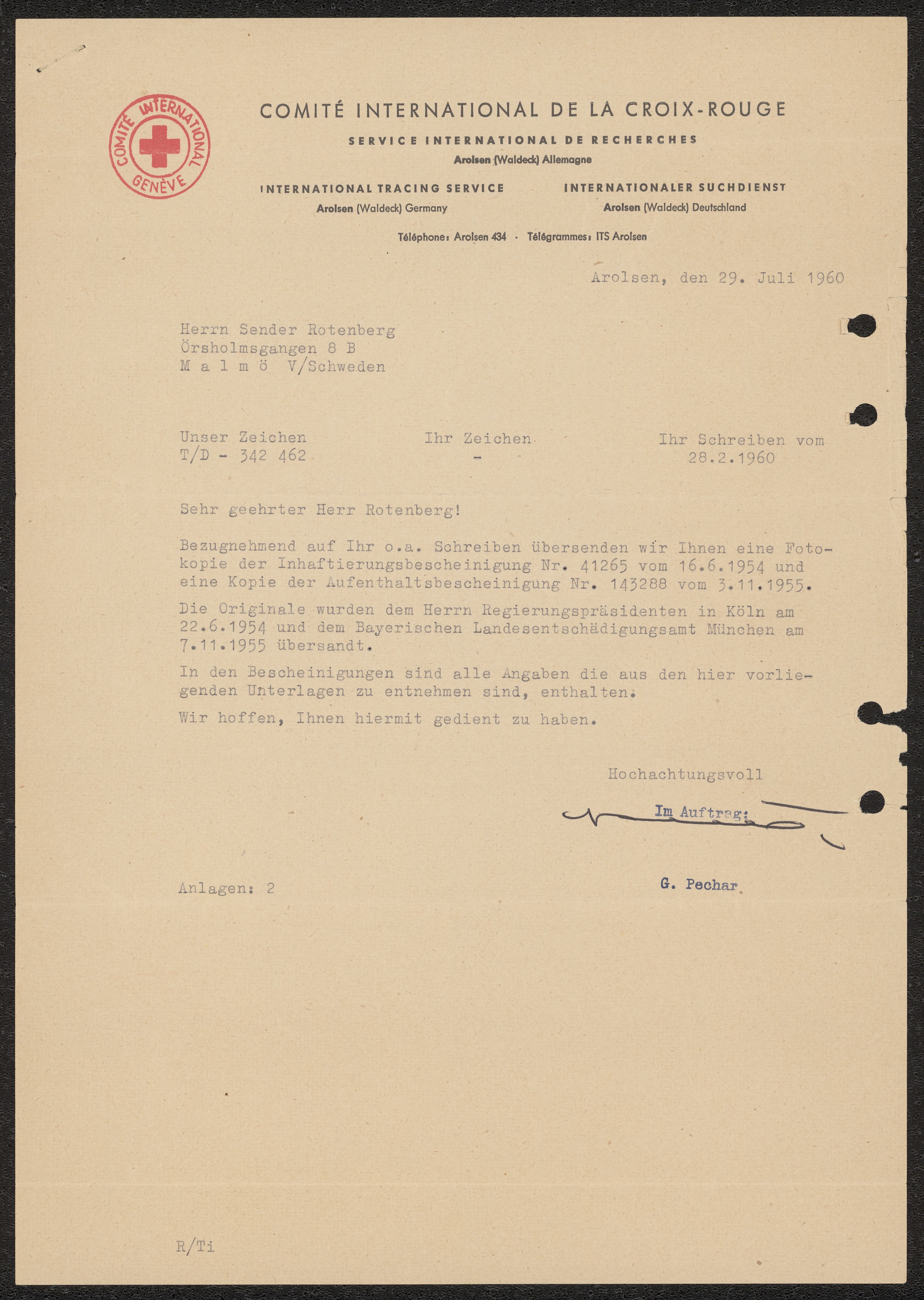 Dokument från International Tracing Service som meddelar att eftersökta handlingar skickats till Sender Rotenberg