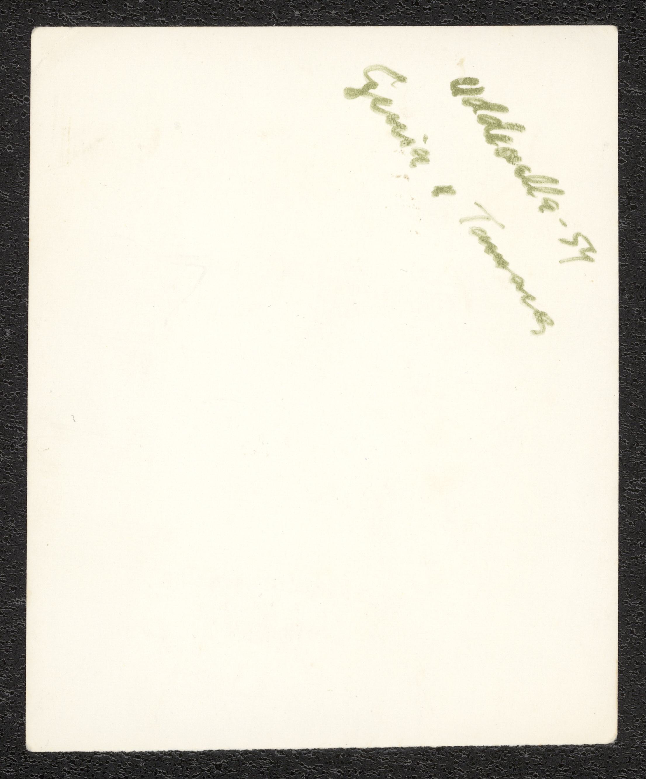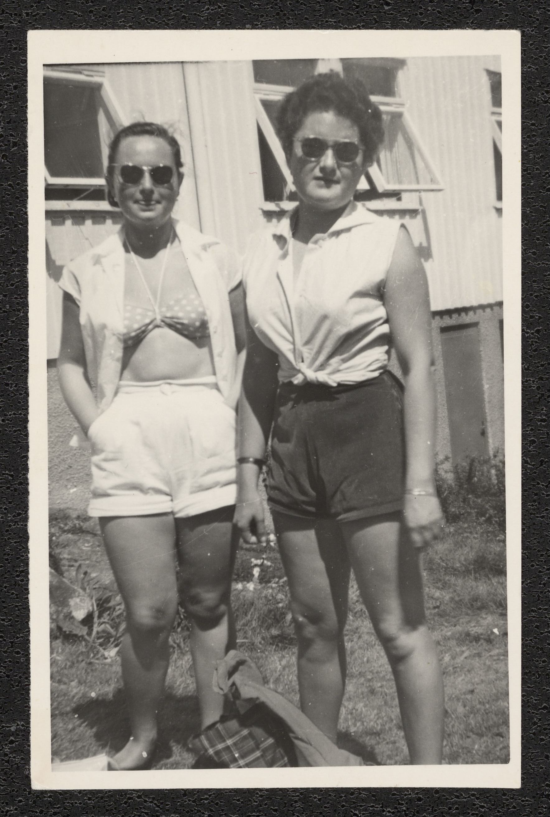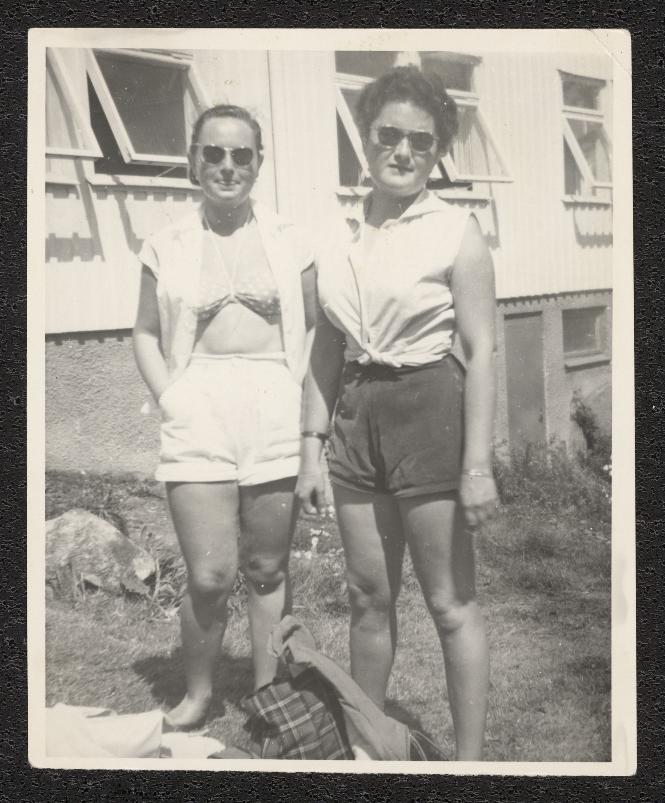 Två kvinnor iförda solglasögon poserar för kameran. Bilden har tillhört Georg Witt och är troligen tagen vid en återträff i Uddevalla på 1950-talet. På baksidan finns texten "Uddevalla -54 Genia och Tamara", troligen Eugenia Göndör och Tamara Nussbaum.