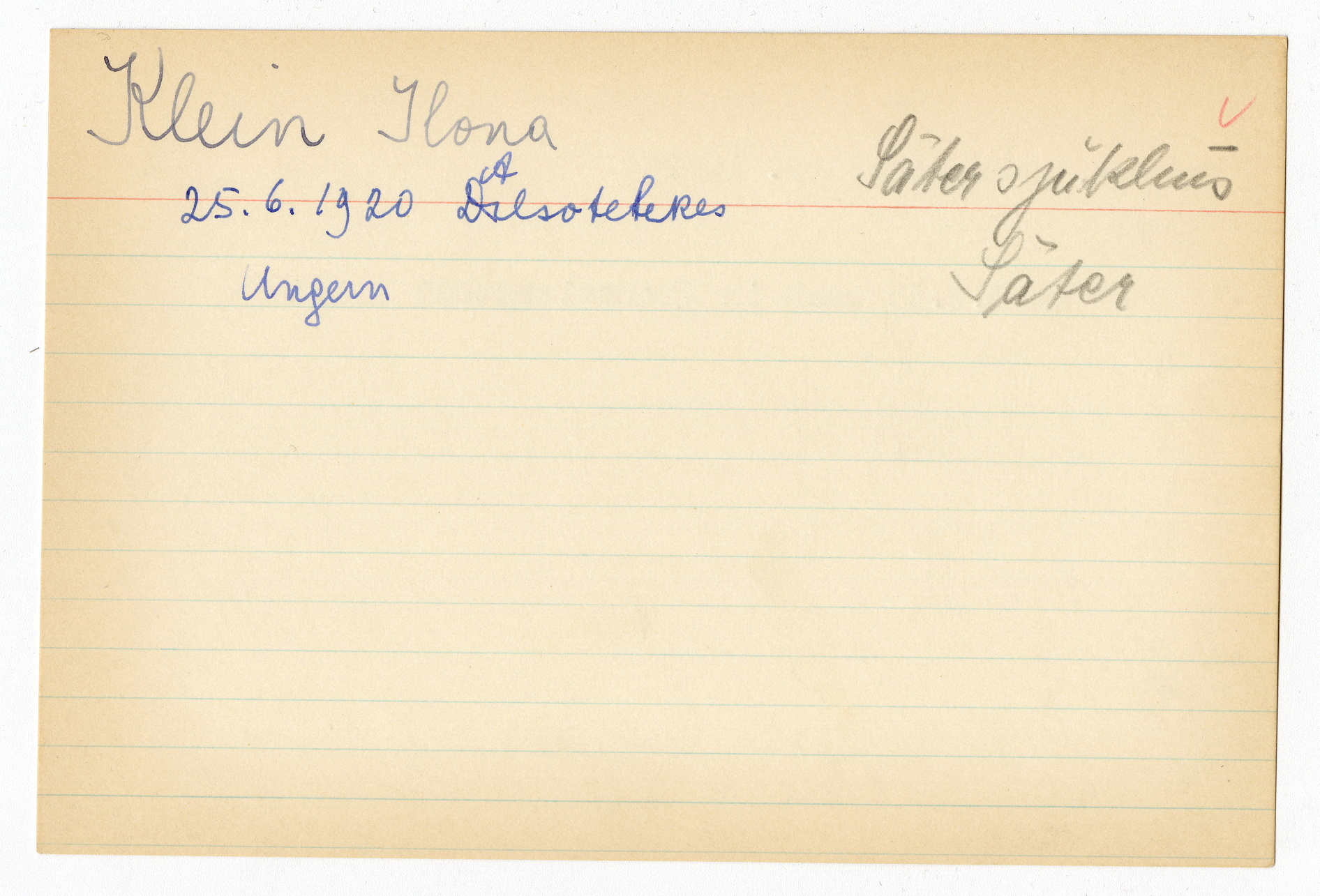 Ett skrivkort med patientuppgifter gällande Ilona Klein. På baksidan uppgifter om matpaket till Josua Schenk i Theresienstadt.