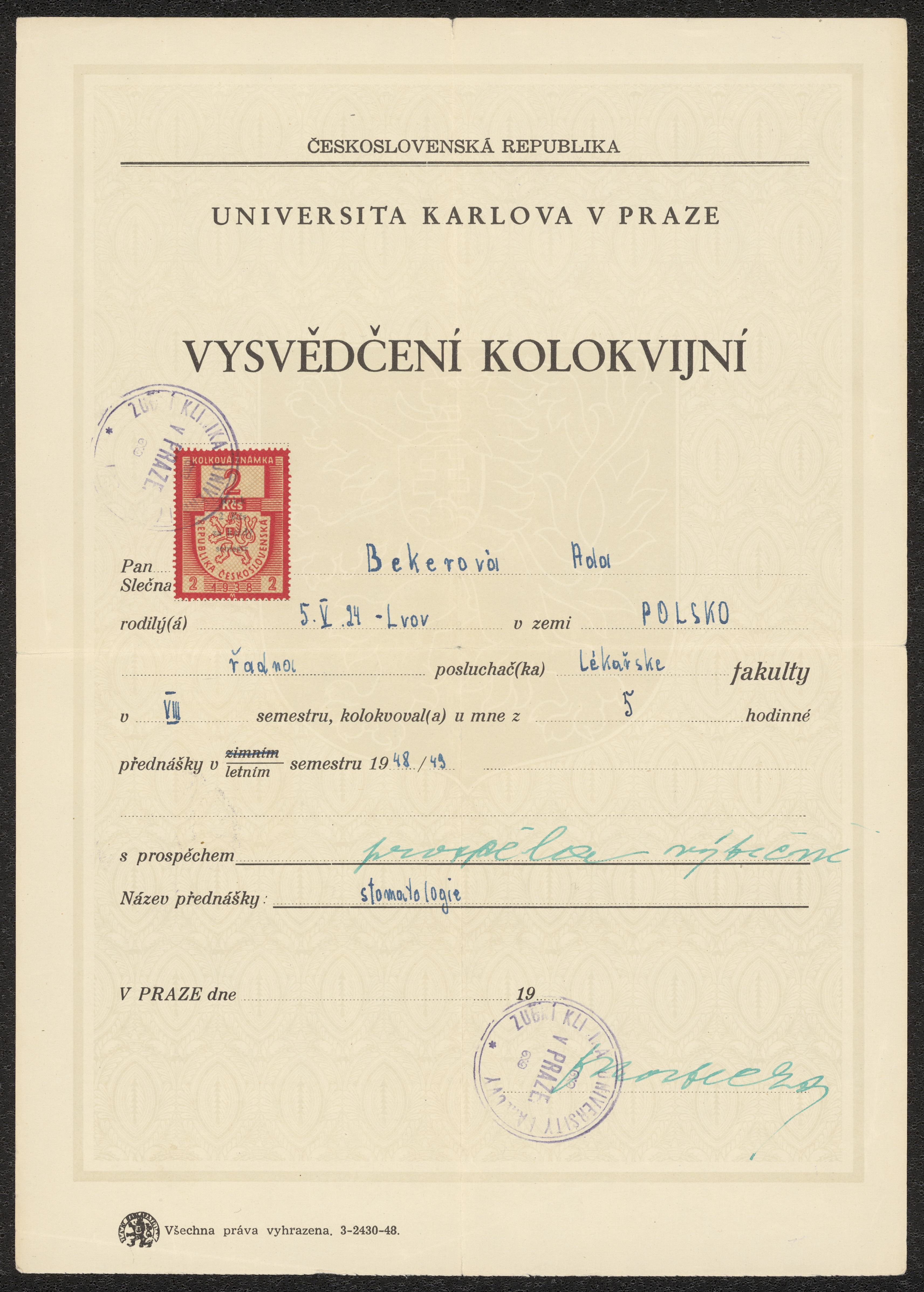 Certifikat för deltagande i seminarier i Prag, för student Ada Becker.