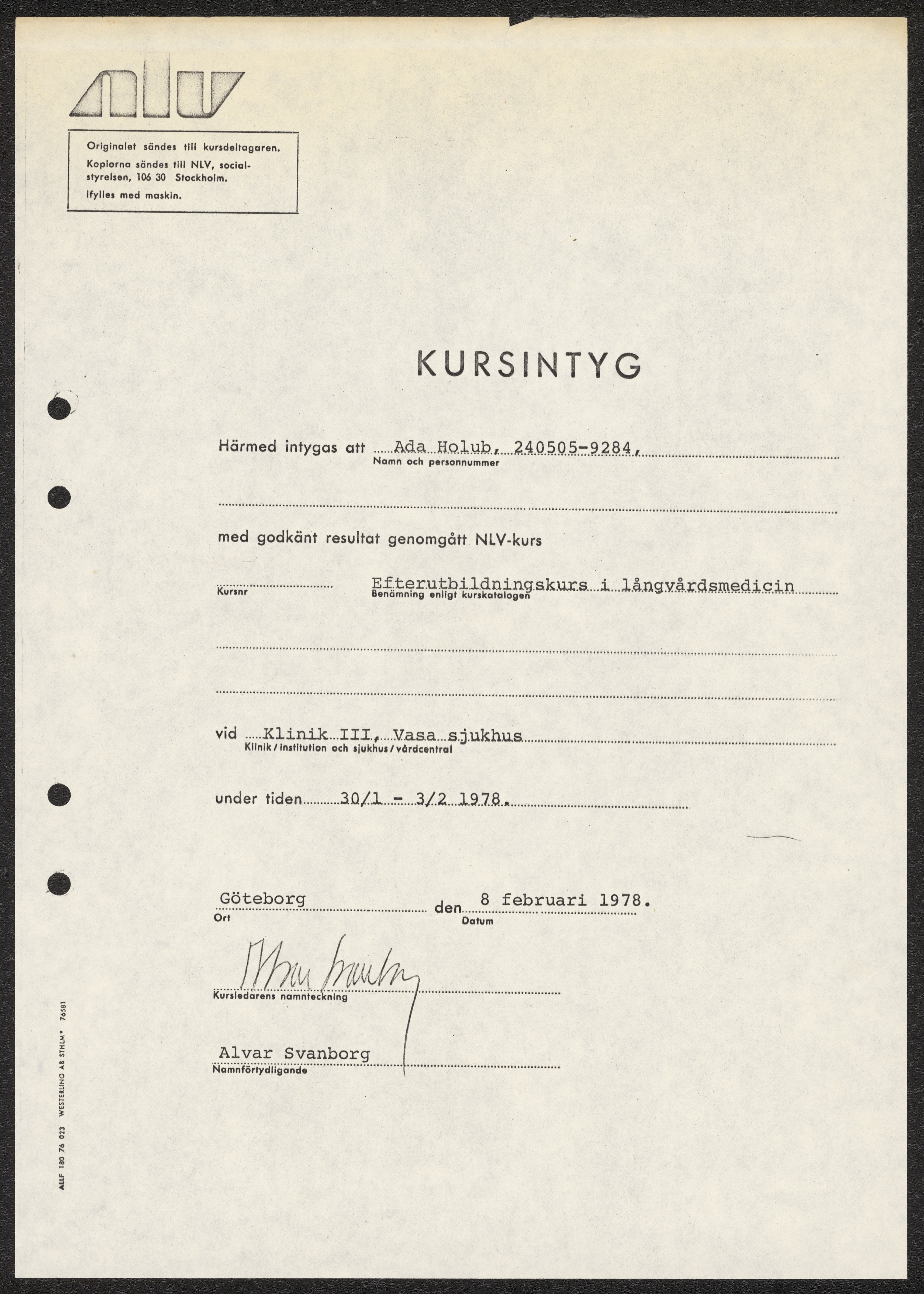 Kursintyg för genomgången efterutbildningskurs i långvårdsmedicin vid Vasa sjukhus 1978.