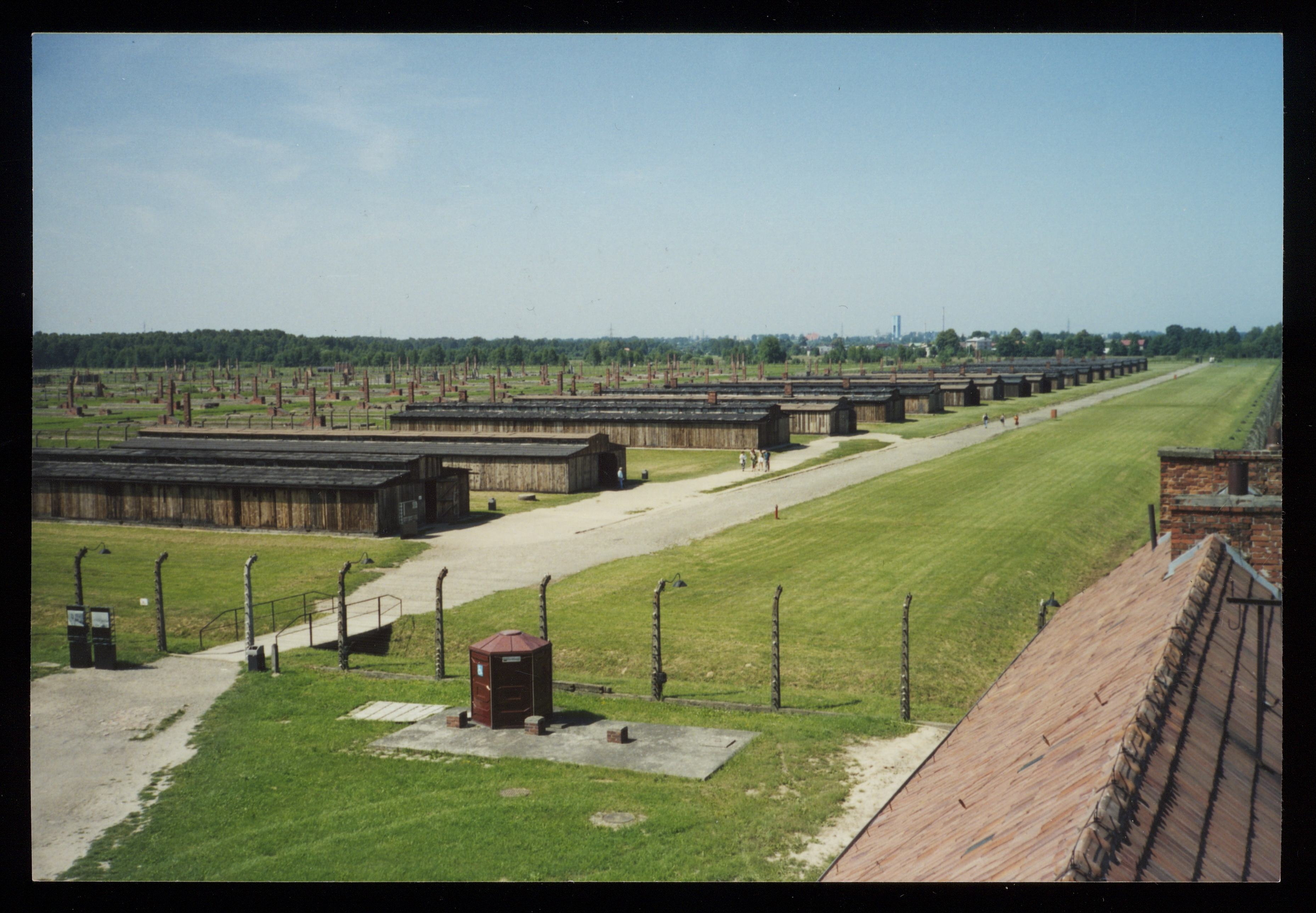 Vy över baracker i Auschwitz-Birkenau. Bilden är tagen i samband med Rosa Gustafssons återbesök i lägret i juni 2000.
