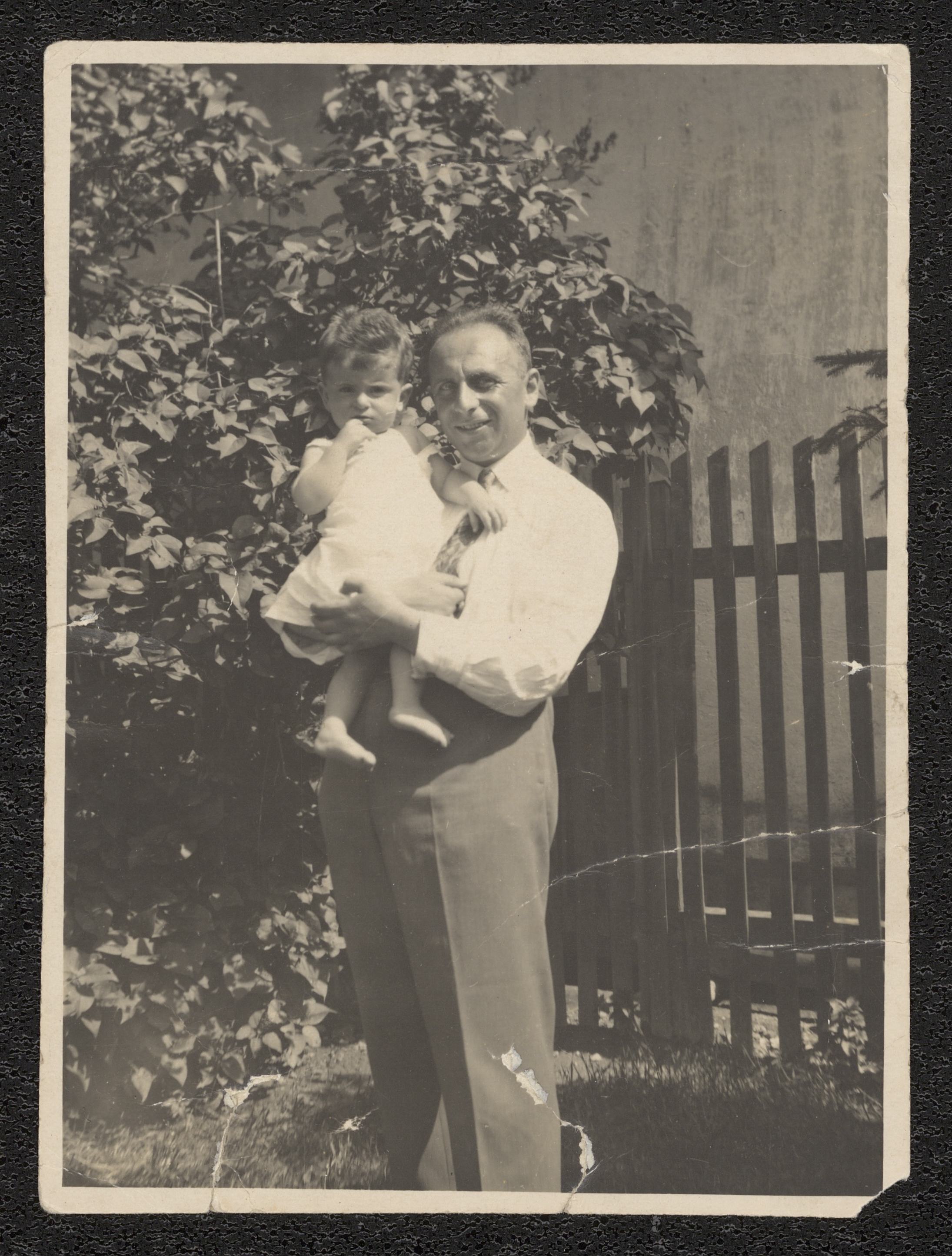 Ett fotografi på Otto och Josef Ullmann poserandes framför växter och ett staket ca 1926.