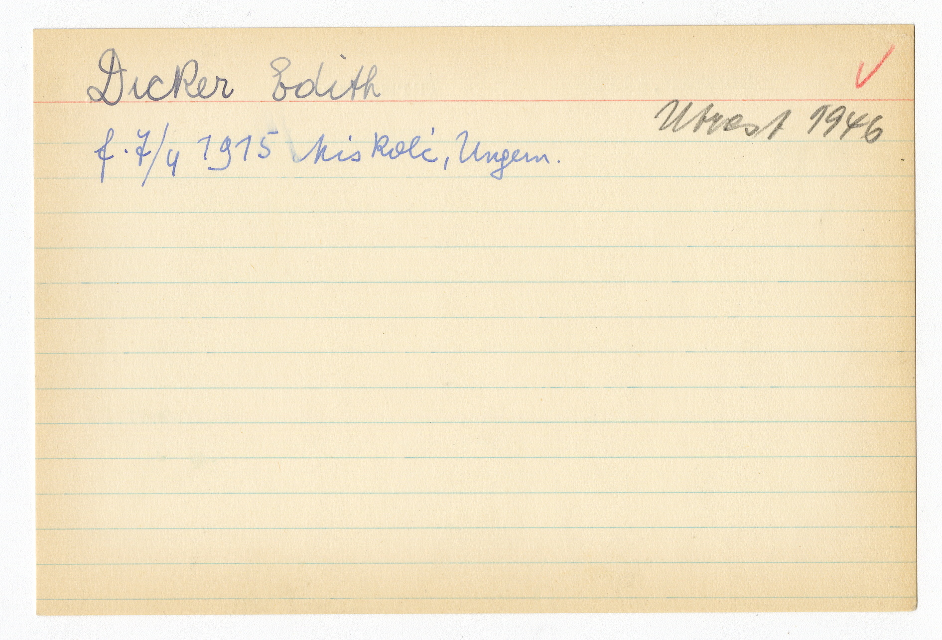 Ett skrivkort med patientuppgifter gällande Edith Dicker. På baksidan uppgifter om matpaket till Alice Sommer i Theresienstadt.