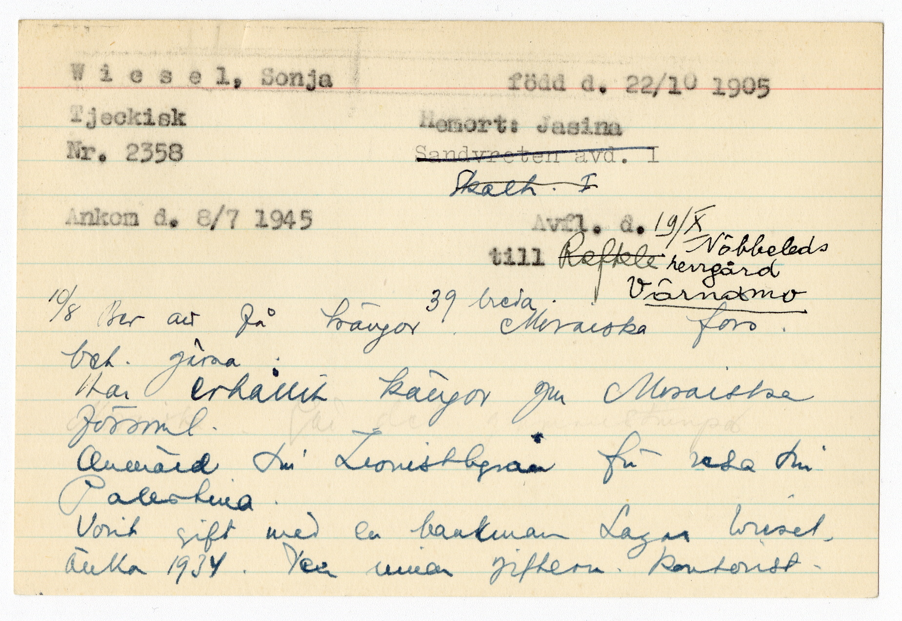 Ett skrivkort med patientuppgifter gällande Sonja Wiesel.