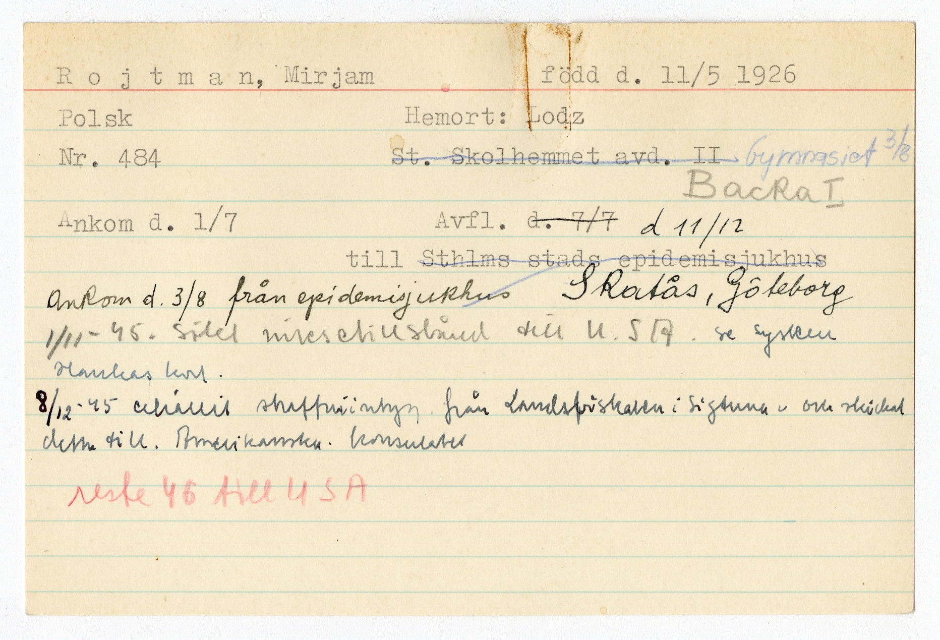 Ett skrivkort med patientuppgifter gällande Mirjam Rojtman.