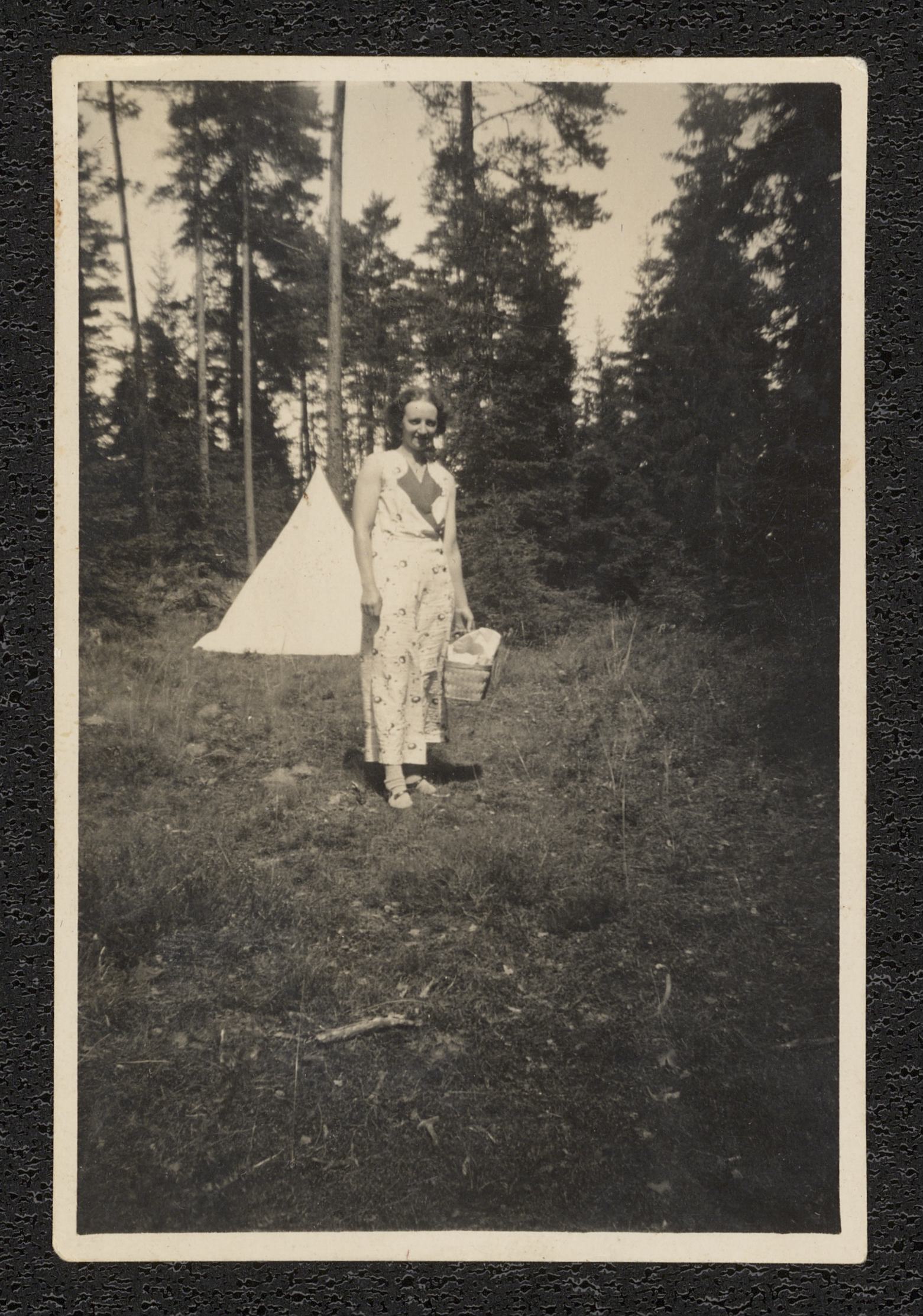 Okänd kvinna poserar framför kameran i skogsbryn. I bakgrunden syns ett tält, och i handen håller hon en picknickkorg. Bilden är troligen tagen på Visingsö.