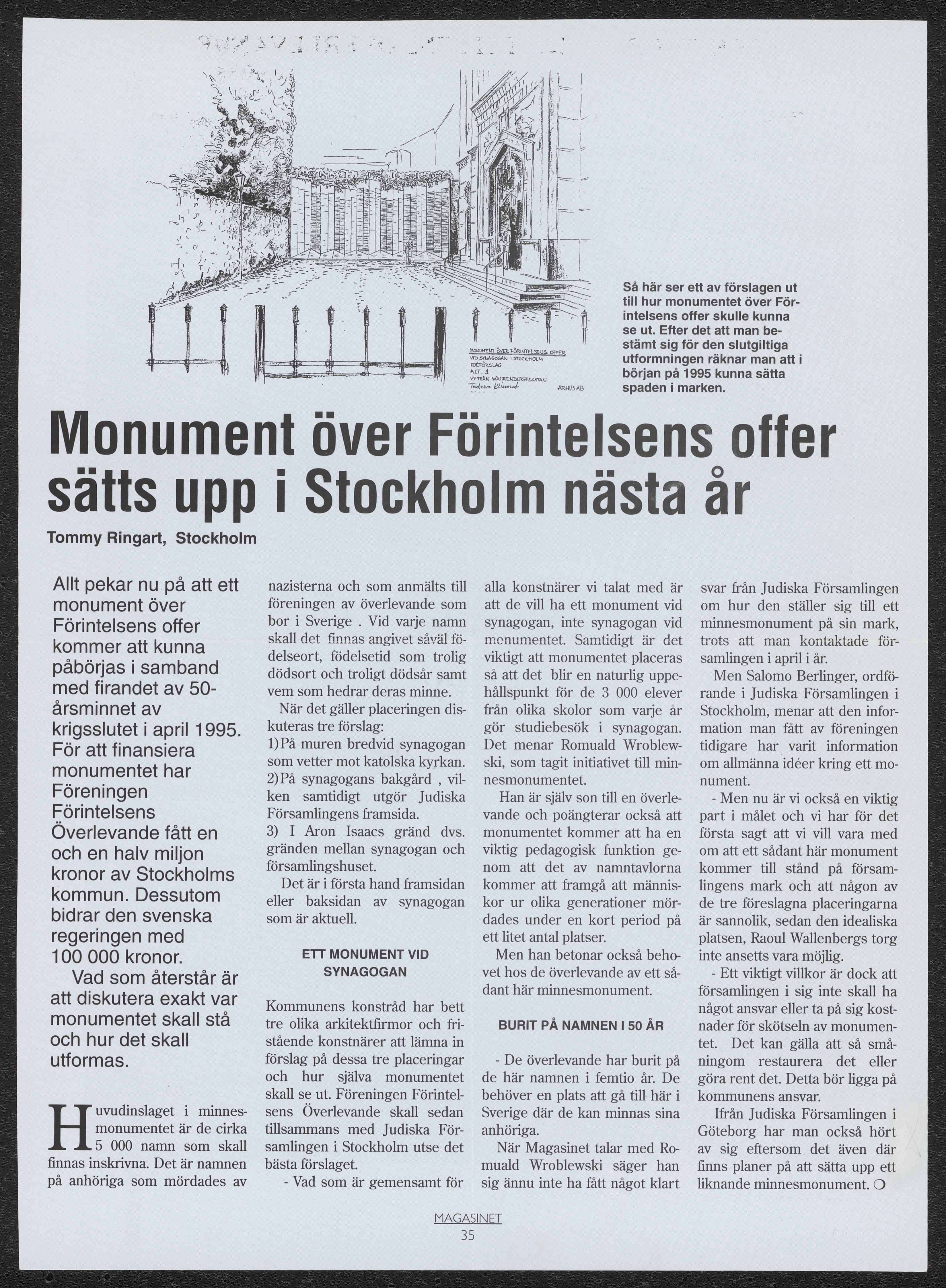 Artikel av Tommy Ringart om monumentet över Förintelsens offer i Stockholm.