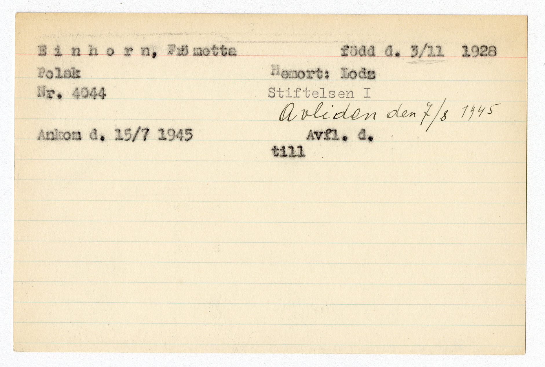 Ett skrivkort med patientuppgifter gällande Frömetta Einhorn.