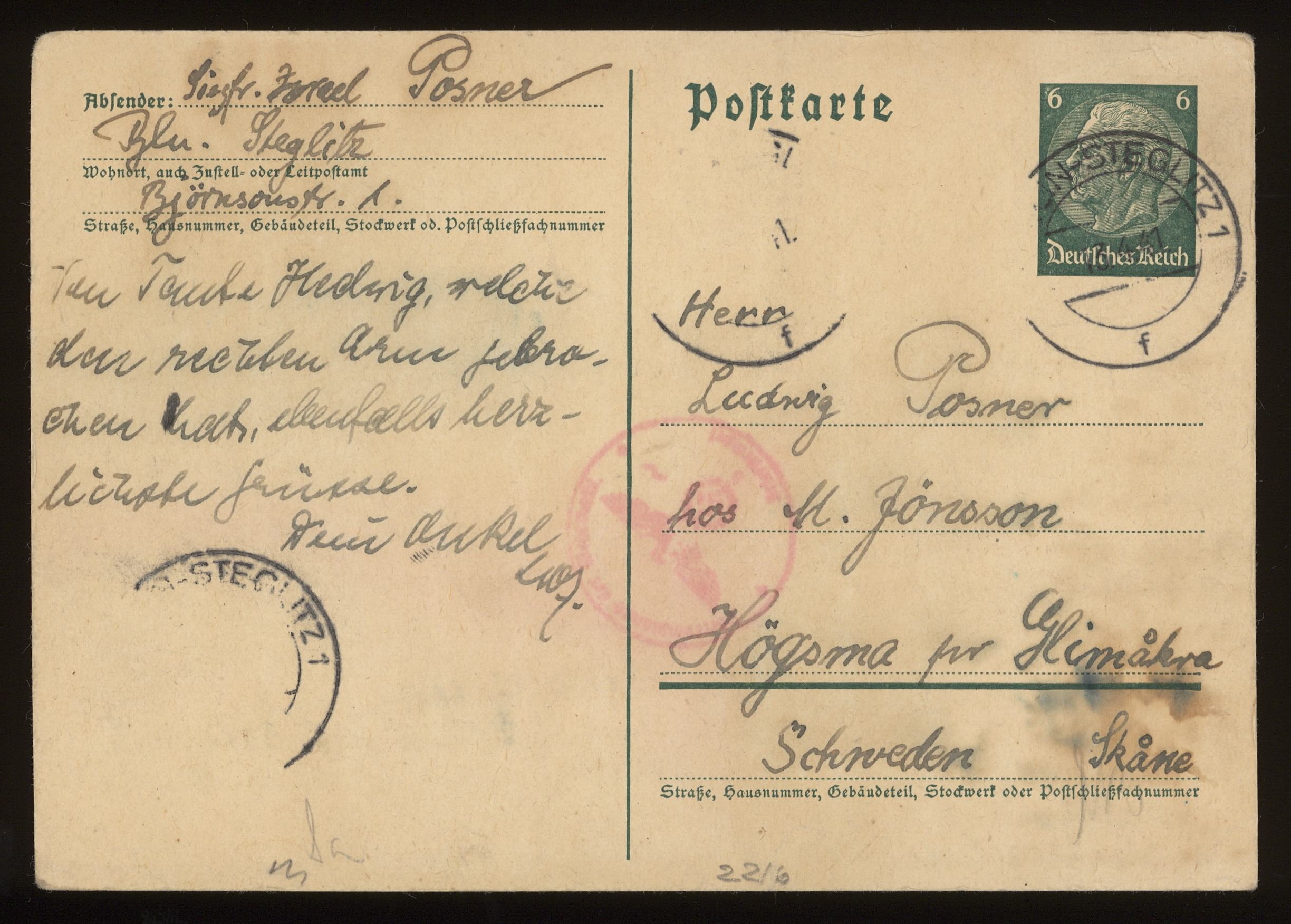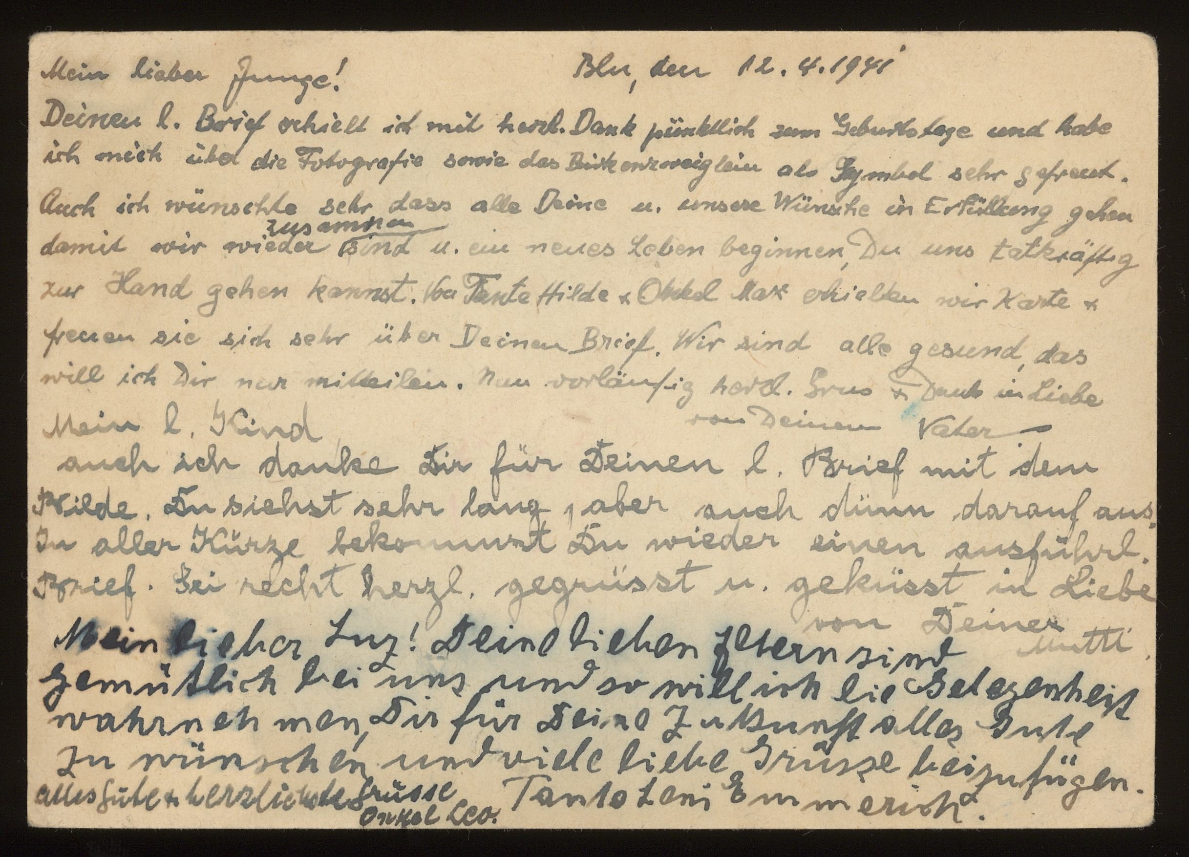 Brevkort från föräldrarna Anna och Siegfried Posner, Onkel Leo och Onkel Lois(?) till sonen Ludwig Posner daterat 12 april 1941.