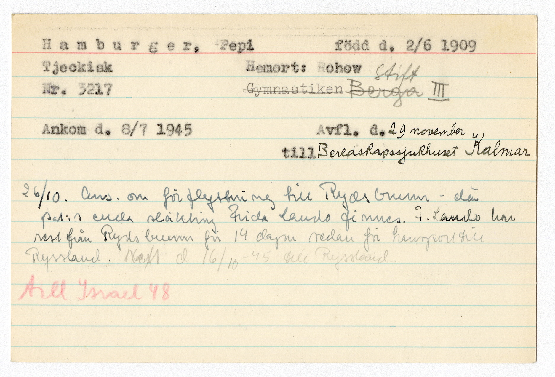 Upphov: Beredskapssjukhuset i Sigtuna. Media: Forum för levande historia. Sveriges museum om Förintelsen/SHM, (PDM) Upphovsrätten till detta verk har gått ut och är därmed fritt att använda på alla sätt. Ange gärna upphovsperson om denne är känd.
