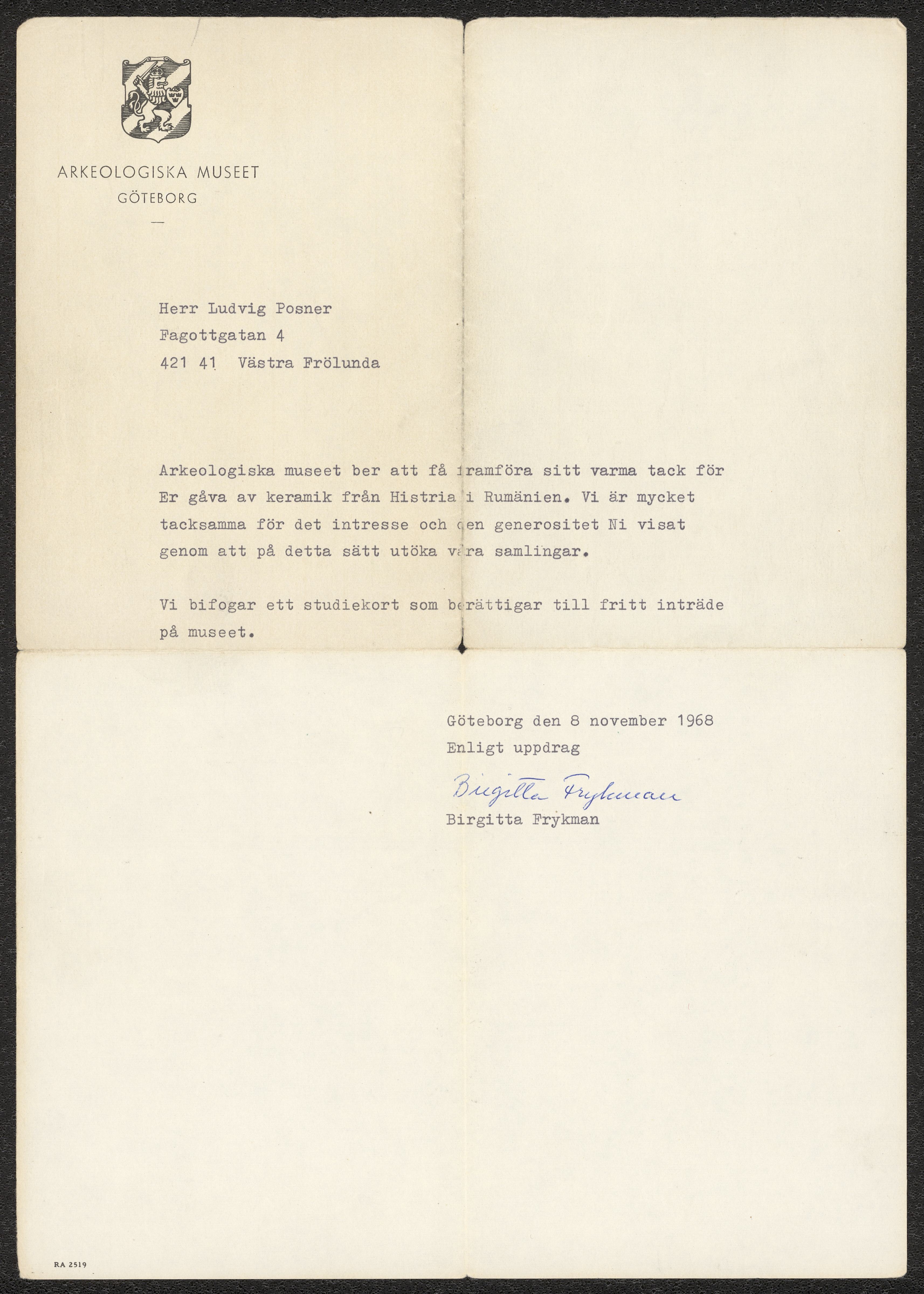 Brev till Ludwig Posner från Arkeologiska museet i Göteborg