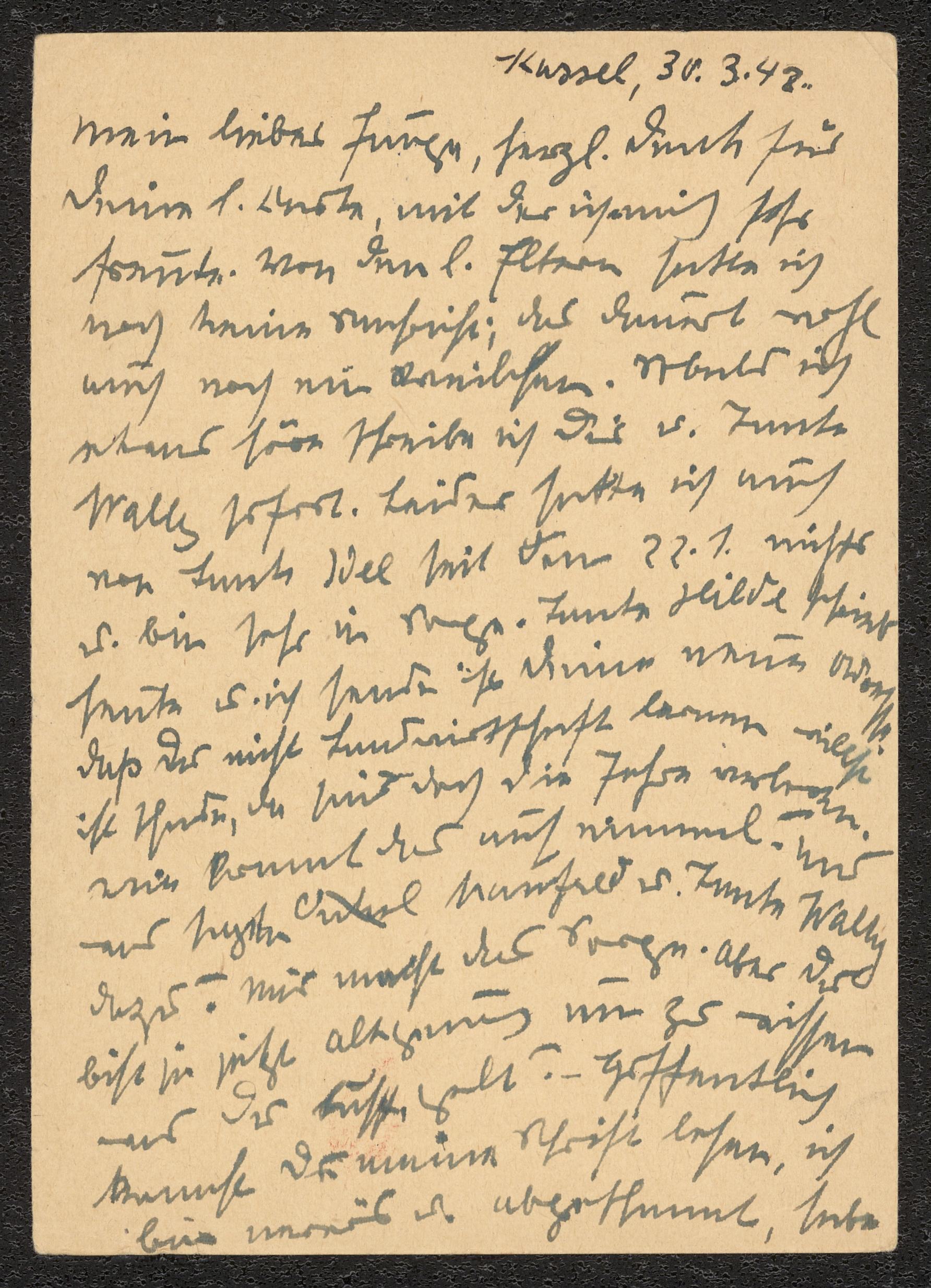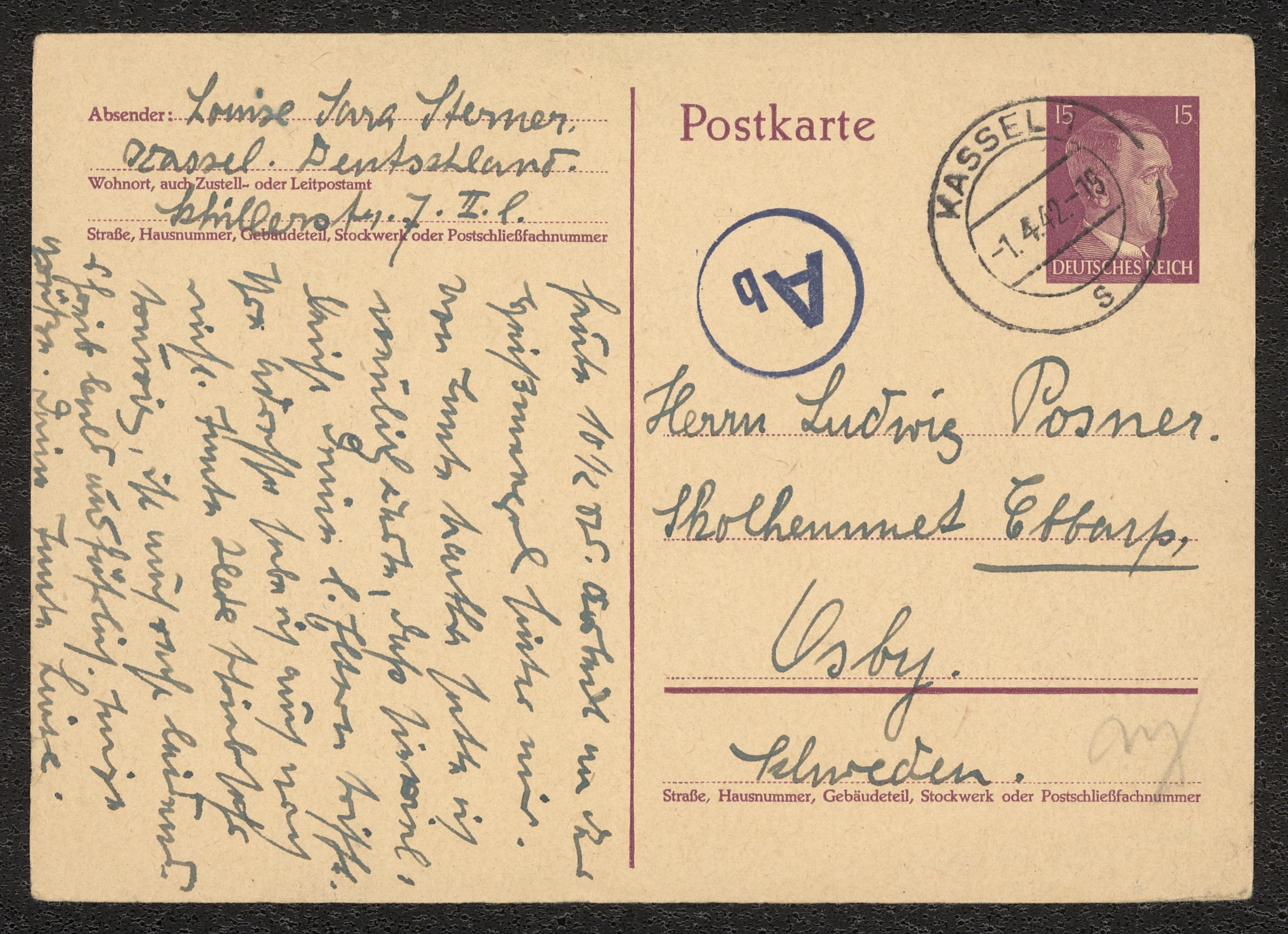 Ett brevkort på två sidor från Ludwigs moster Louise Sterner, Kassel, Tyskland, daterat 1 april 1942. Inkom med förvärv SMF178.