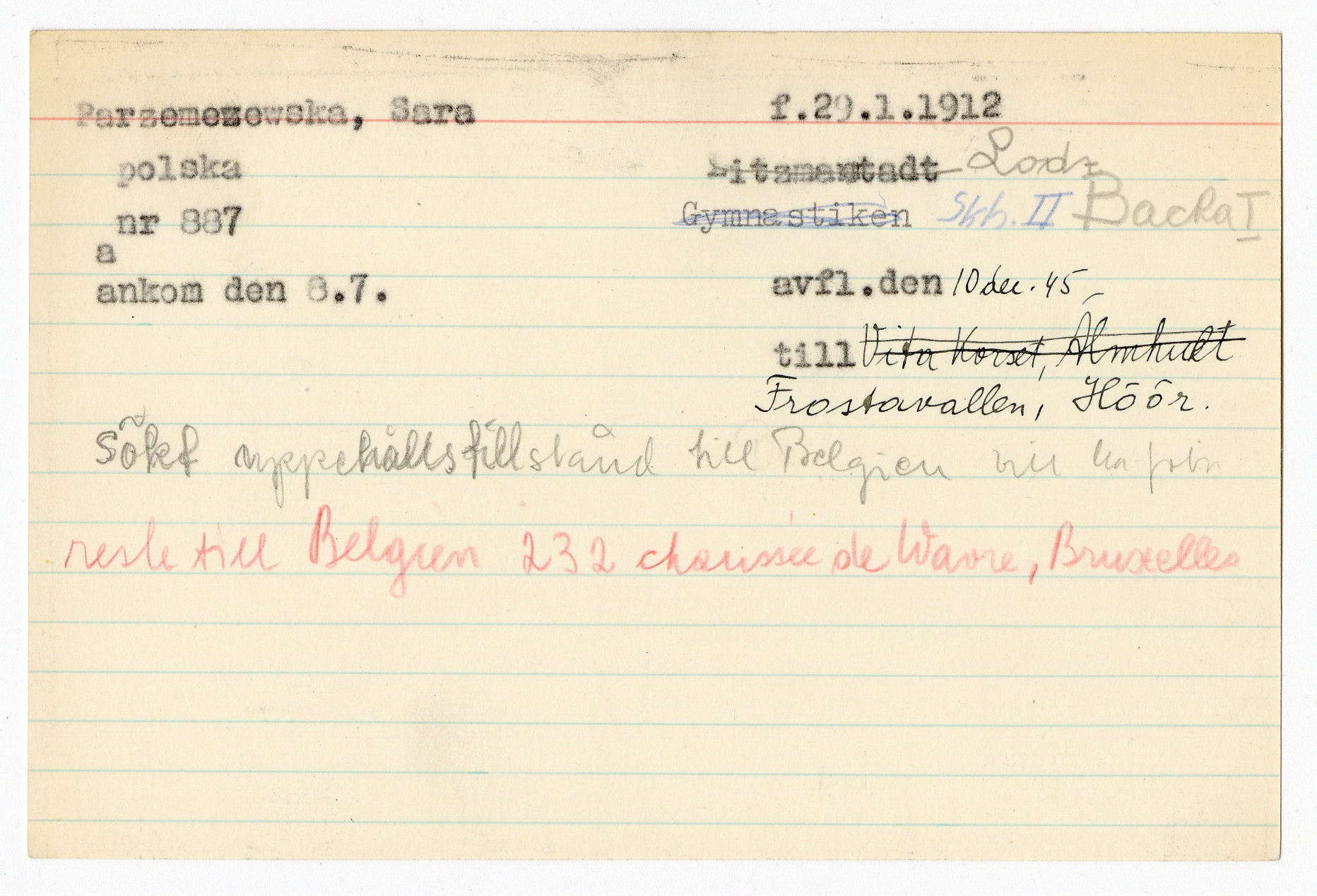 Ett skrivkort med patientuppgifter gällande Sara Parzemezewska.
