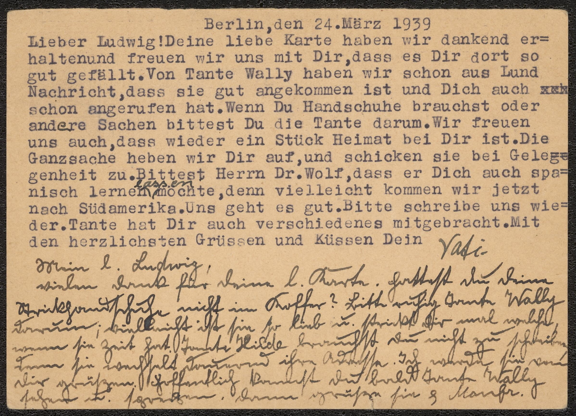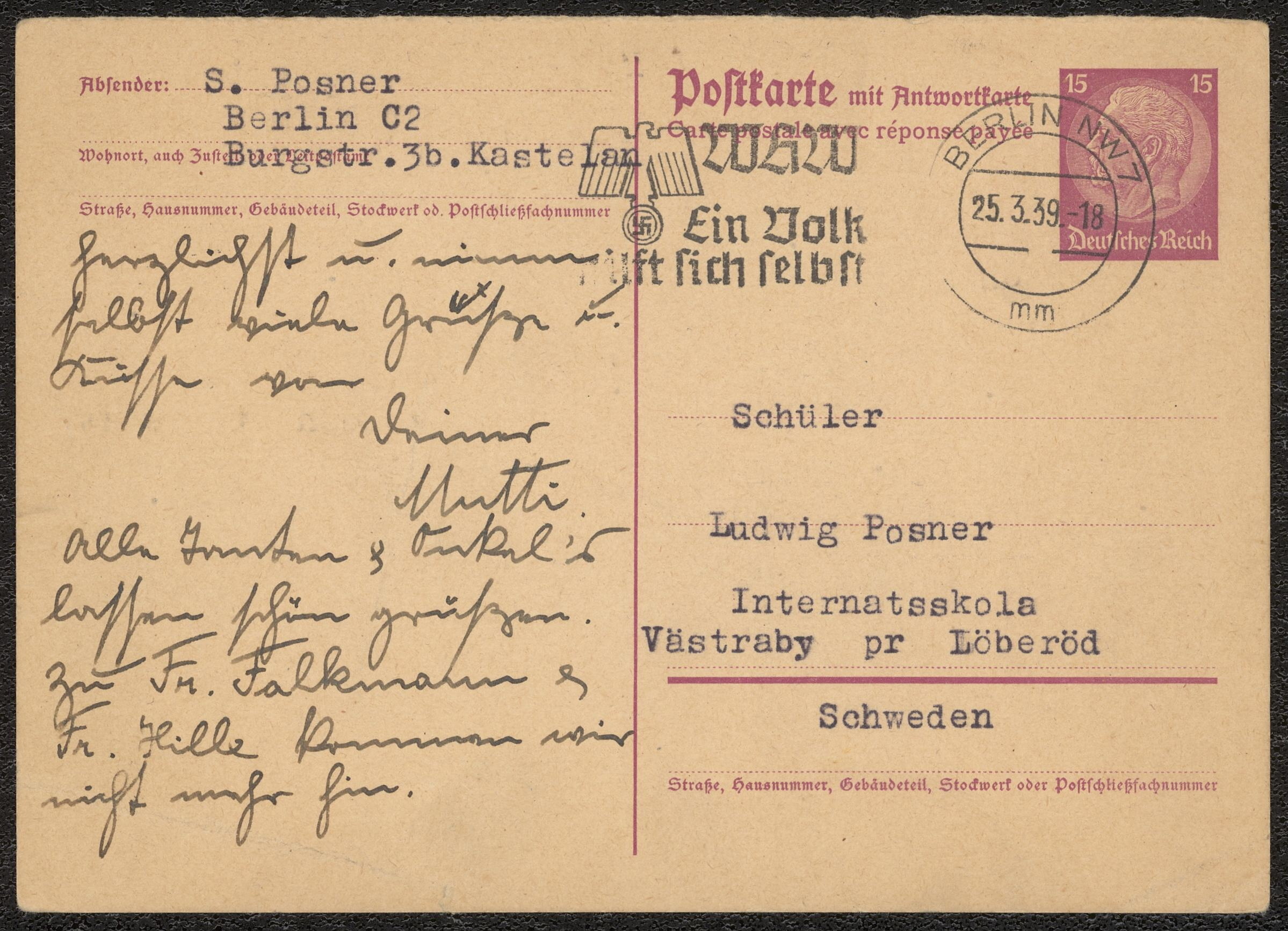Brevkort från föräldrarna Anna och Siegfried Posner och Manfred till Ludwig Posner daterat 24 mars 1939.
