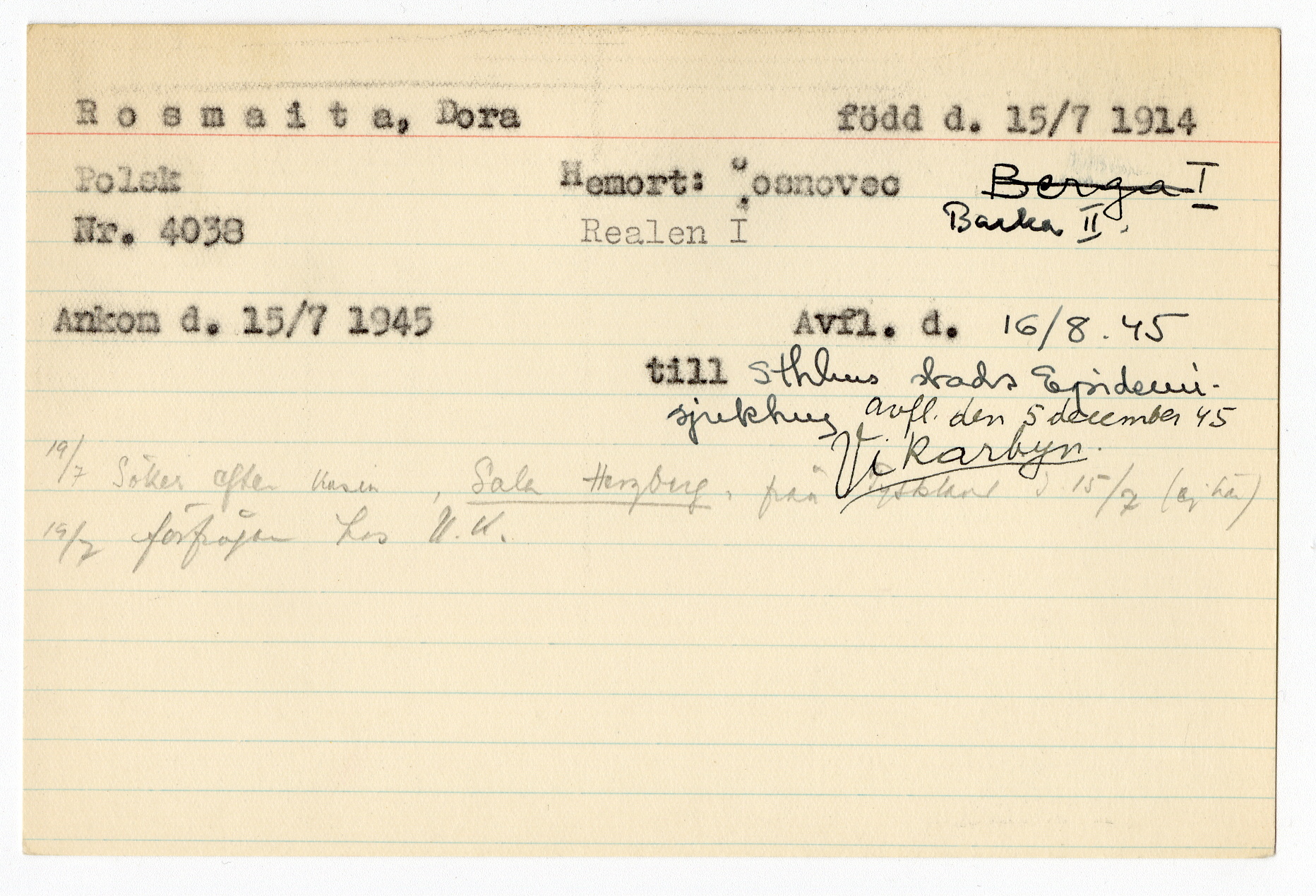 Ett skrivkort med patientuppgifter gällande Dora Rosmaita.