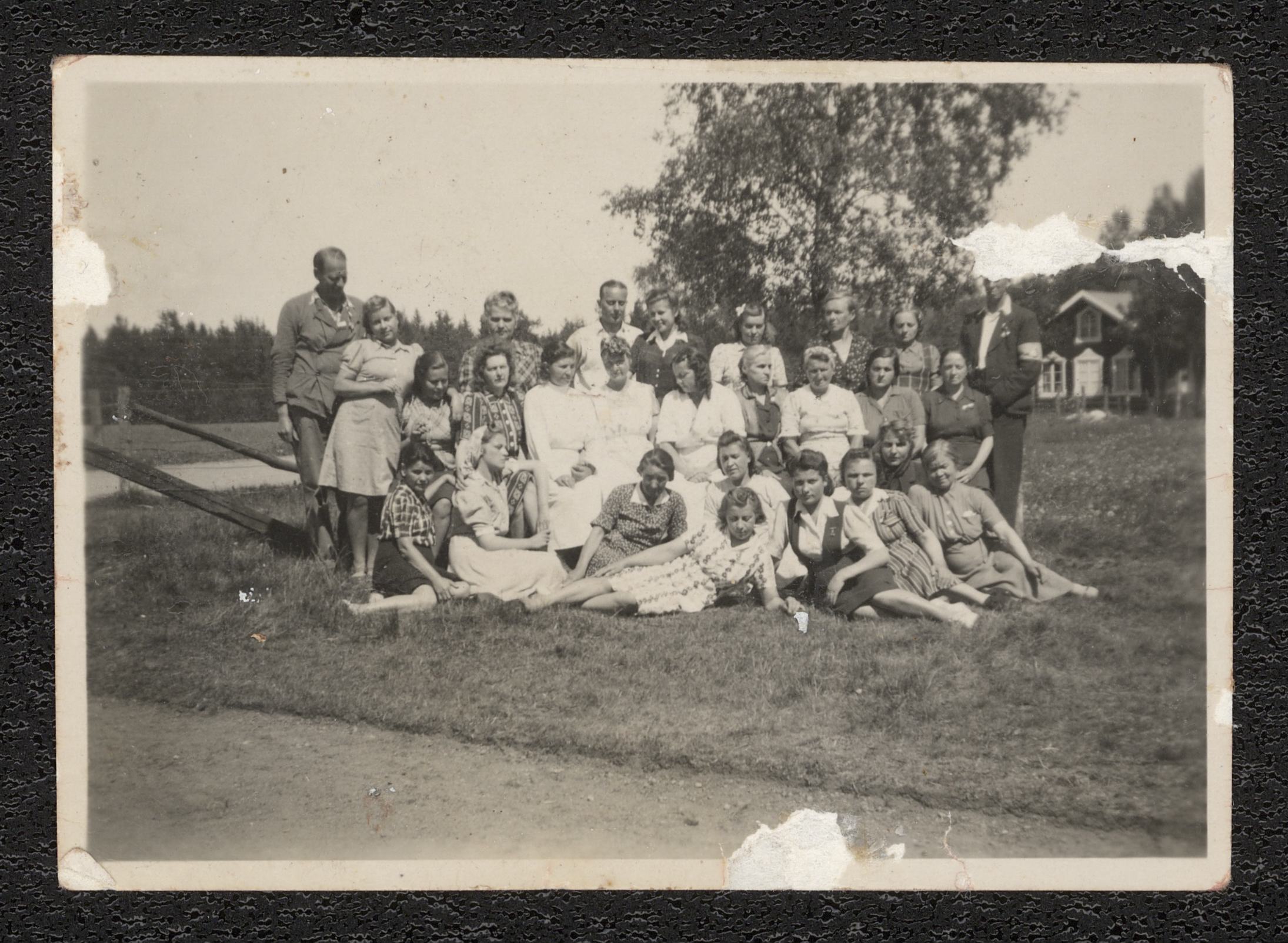 Gruppfotografi taget i utomhusmiljö. Ett tjugotal kvinnor och tre män har ställt upp sig för fotografering. Bakom dem syns en utslagen björl och en byggnad. Bildens ursprung är okänt, men har tillhört Rosa Gustafsson. Kvinnorna kom troligen samtidigt med Rosa till Sverige 1945. På baksidan finns texten: A(r)ne ? Randau (?)Vilhelmsberg Husqvarna.
