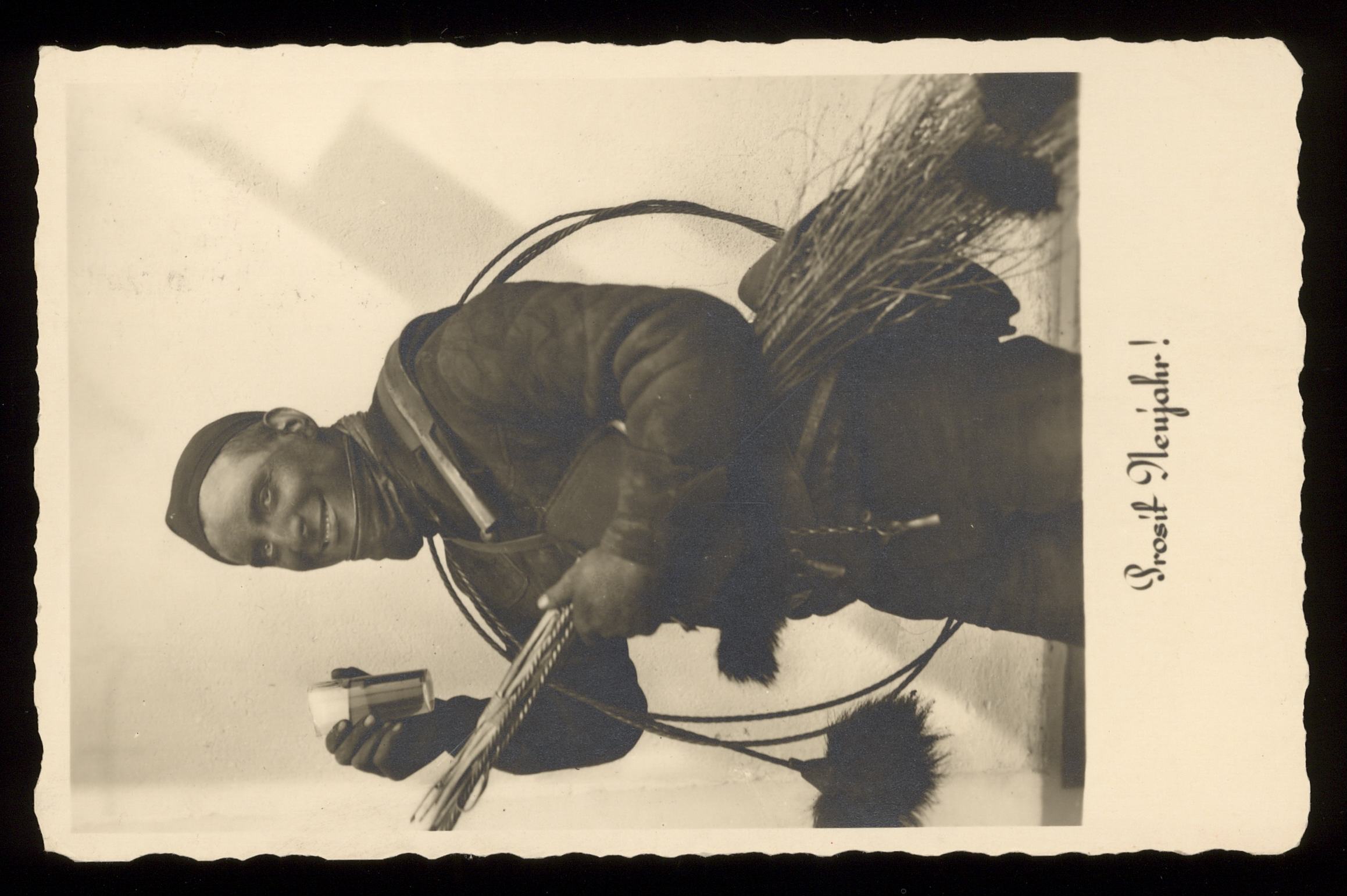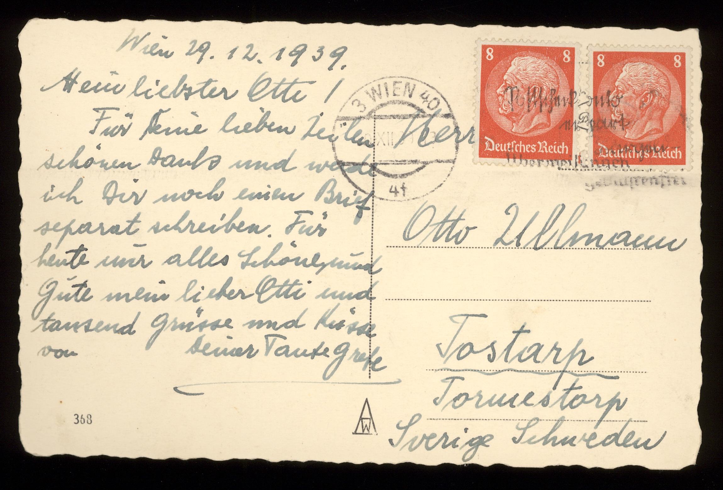 Vykort till Otto Ullman med texten "Prosit Neujahr!" (Gott Nytt År!) från moster Grete Kollmann daterat 29 december 1939 Wien.