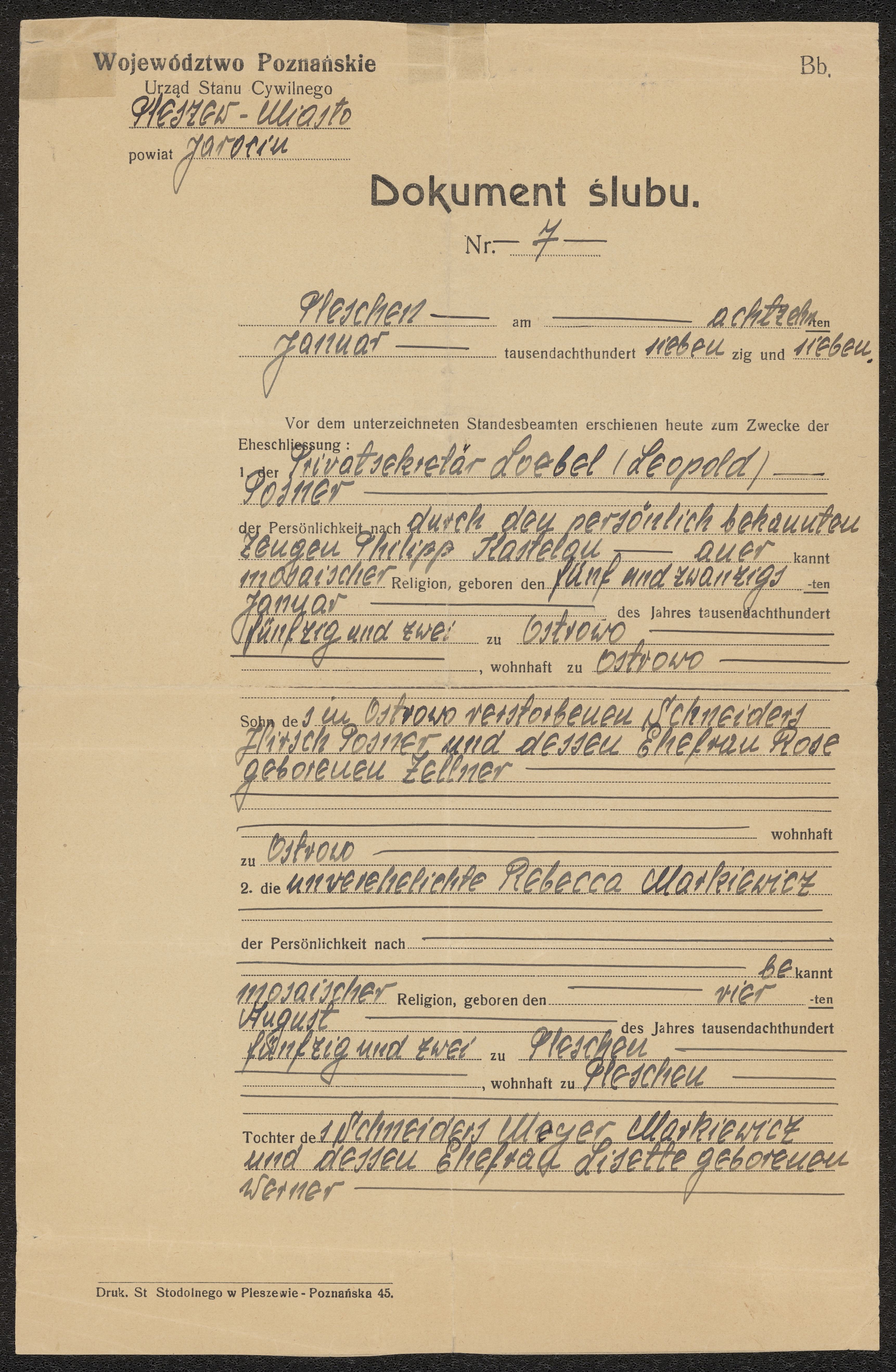 Vigselbevis Leopold och Rebecca Posner