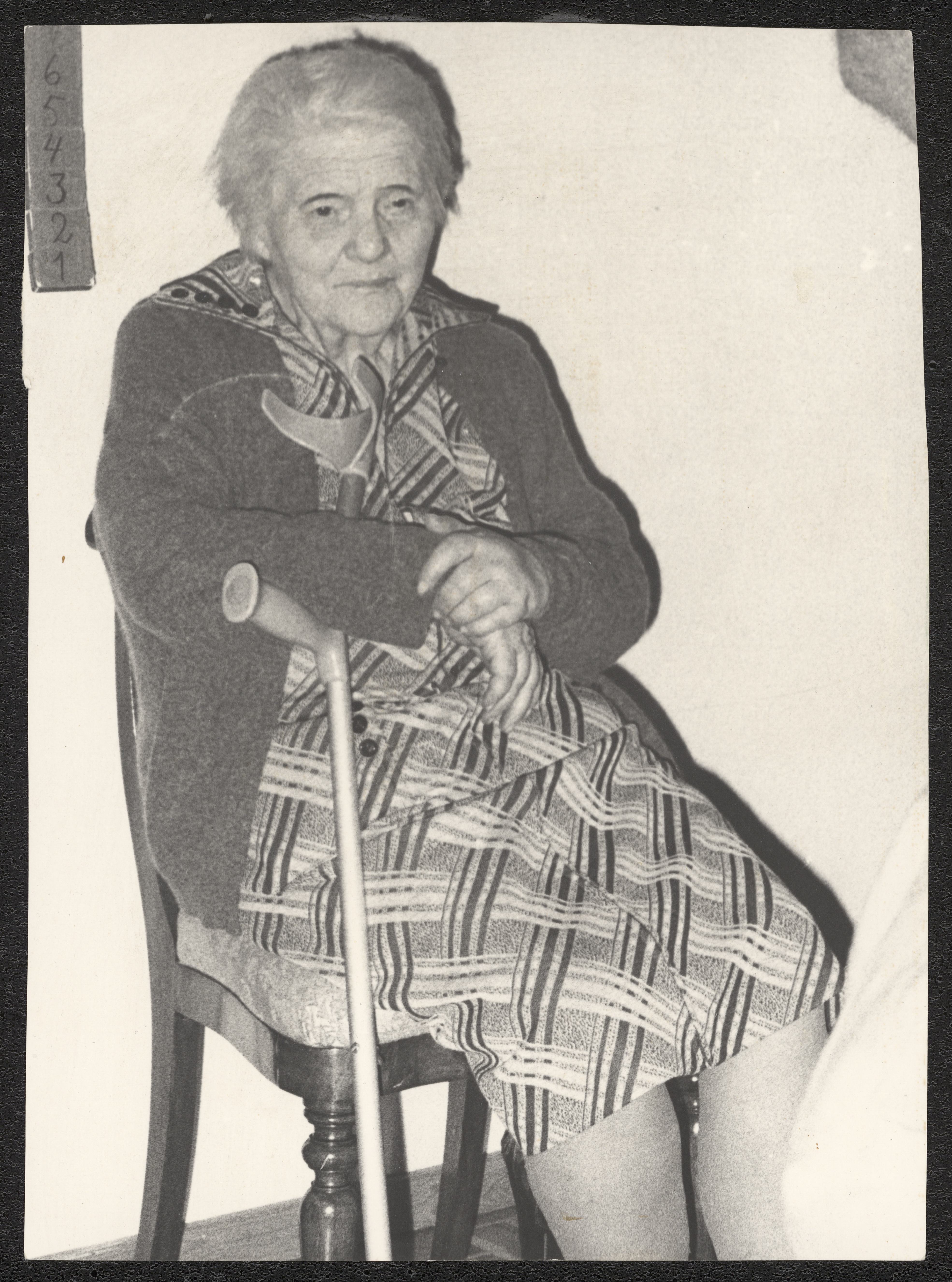 Porträttfotografi av Alice Witt som äldre. Hon sitter på en stol och håller en krycka under armen.