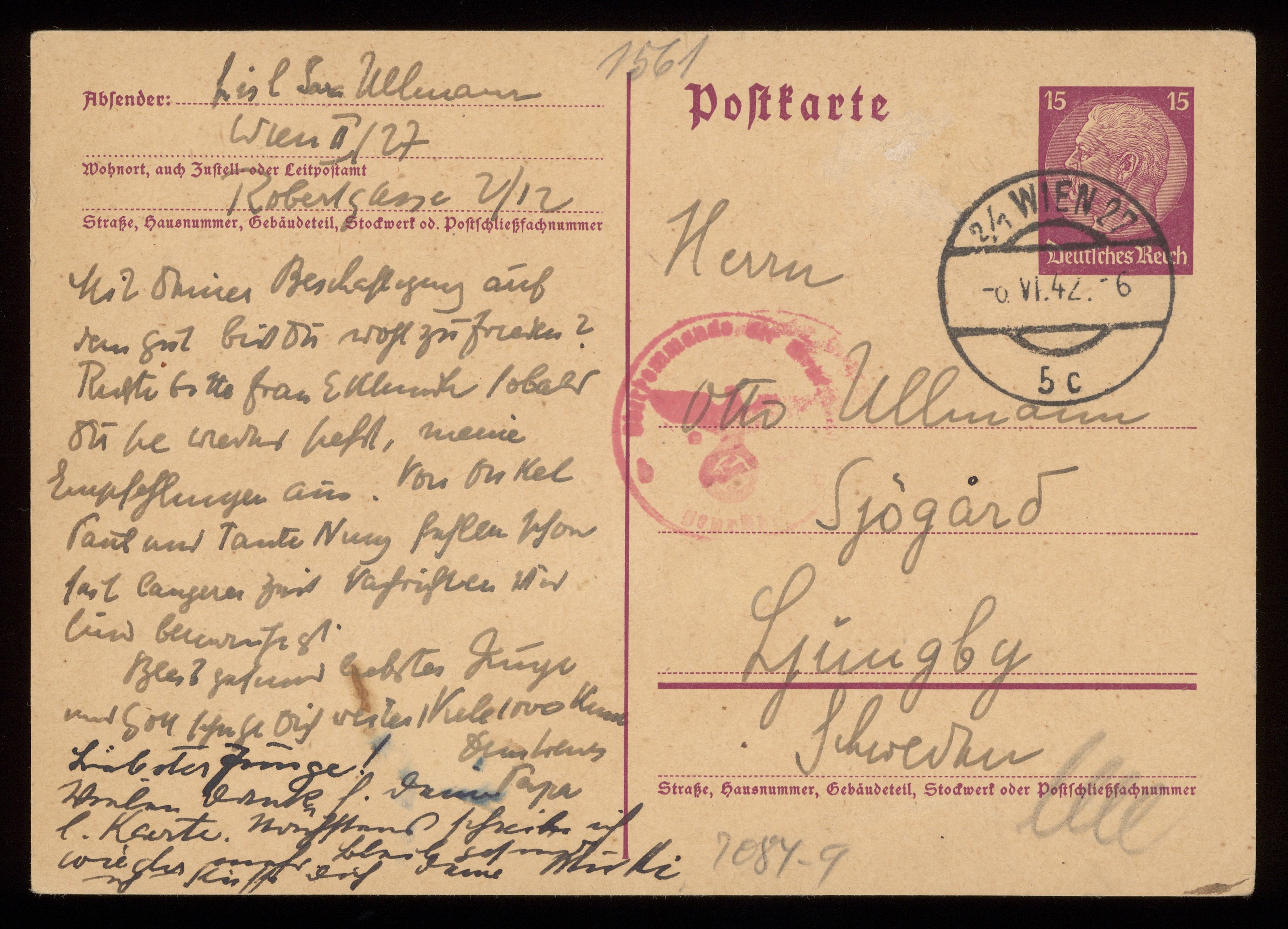 Brev till Otto Ullman från föräldrarna Josef och Elise Ullmann daterat 6 juni 1942 Wien.