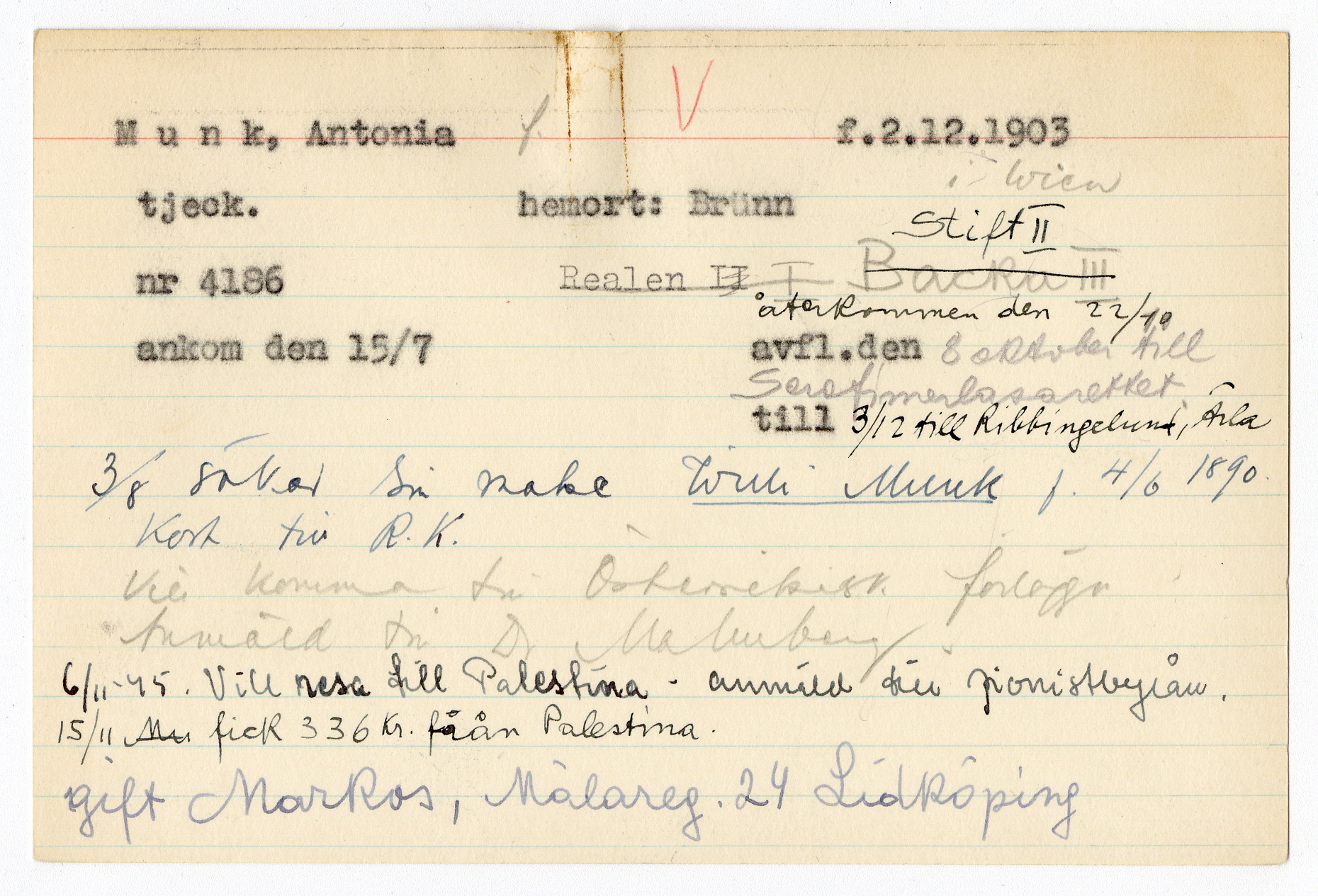 Ett skrivkort med patientuppgifter gällande Antonia Markos f. Munk.