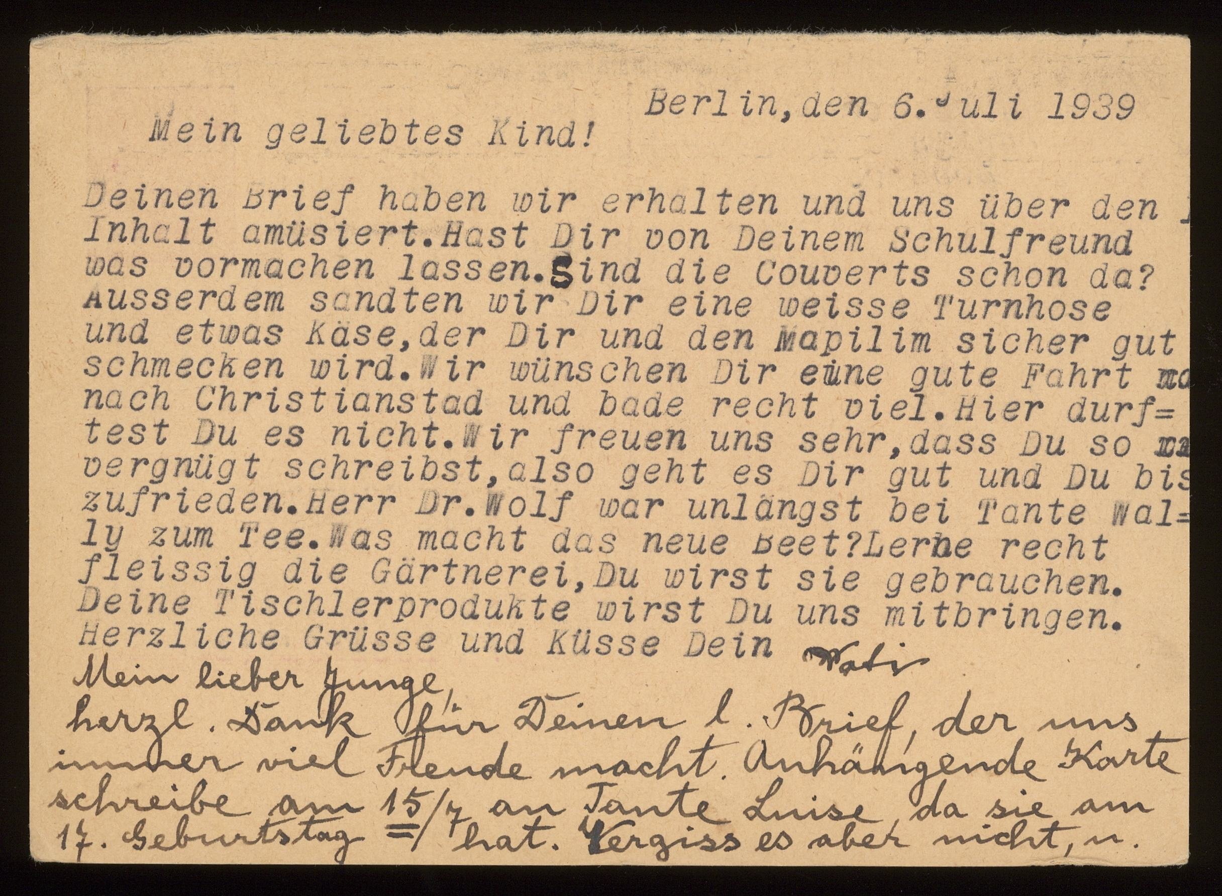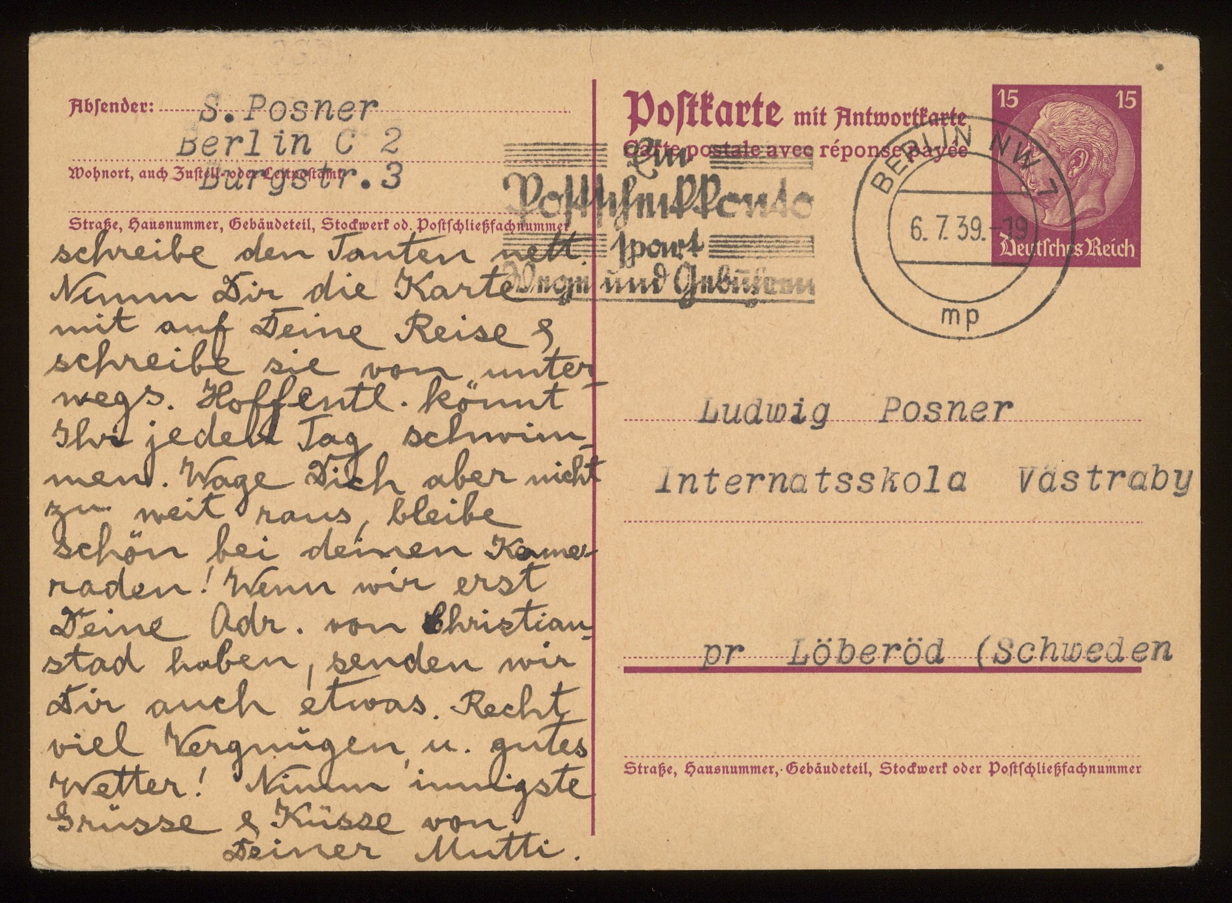 Brevkort från föräldrarna Anna och Siegfried Posner och Onkel Carl till Ludwig Posner daterat 6 juli 1939.