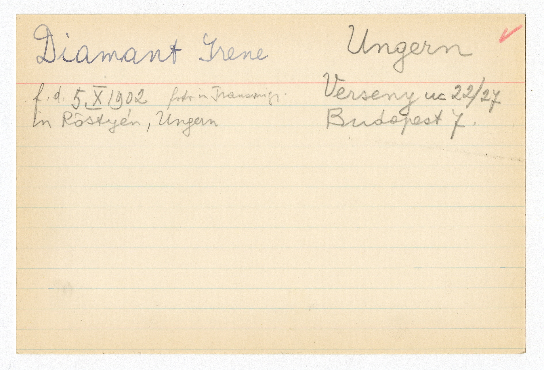 Ett skrivkort med patientuppgifter gällande Irene Diamant. På baksidan uppgifter om matpaket till Jan Scharf i Theresienstadt.